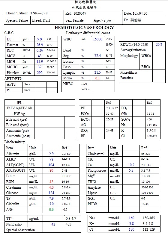 小八血檢中的腎指數也上升許多,