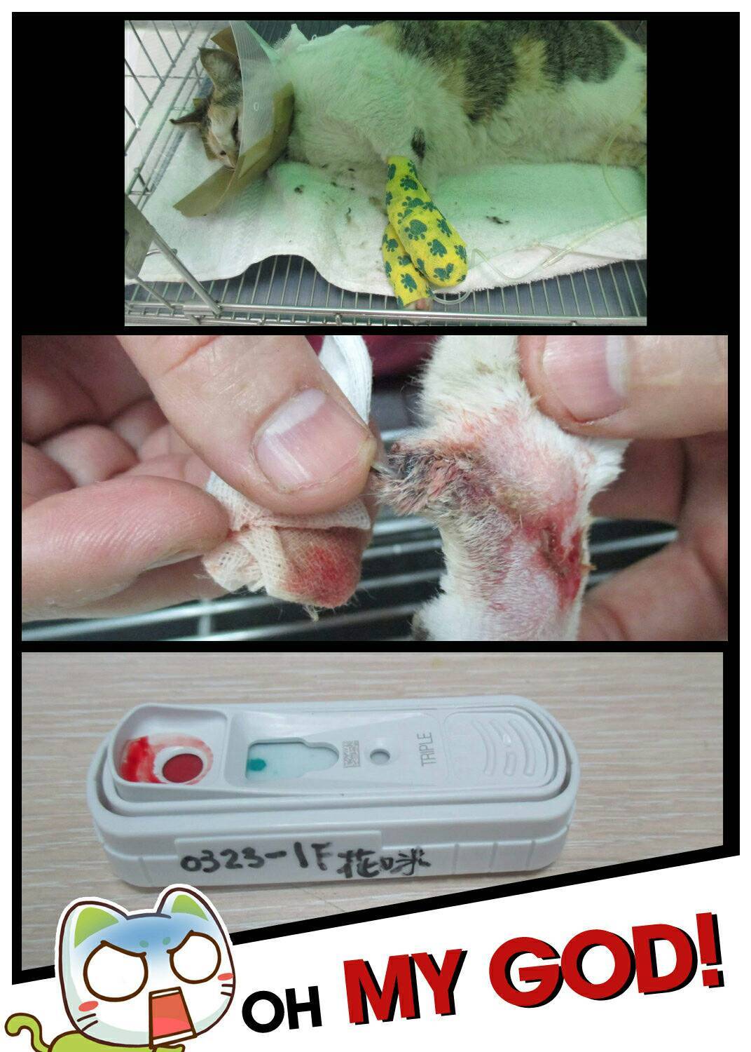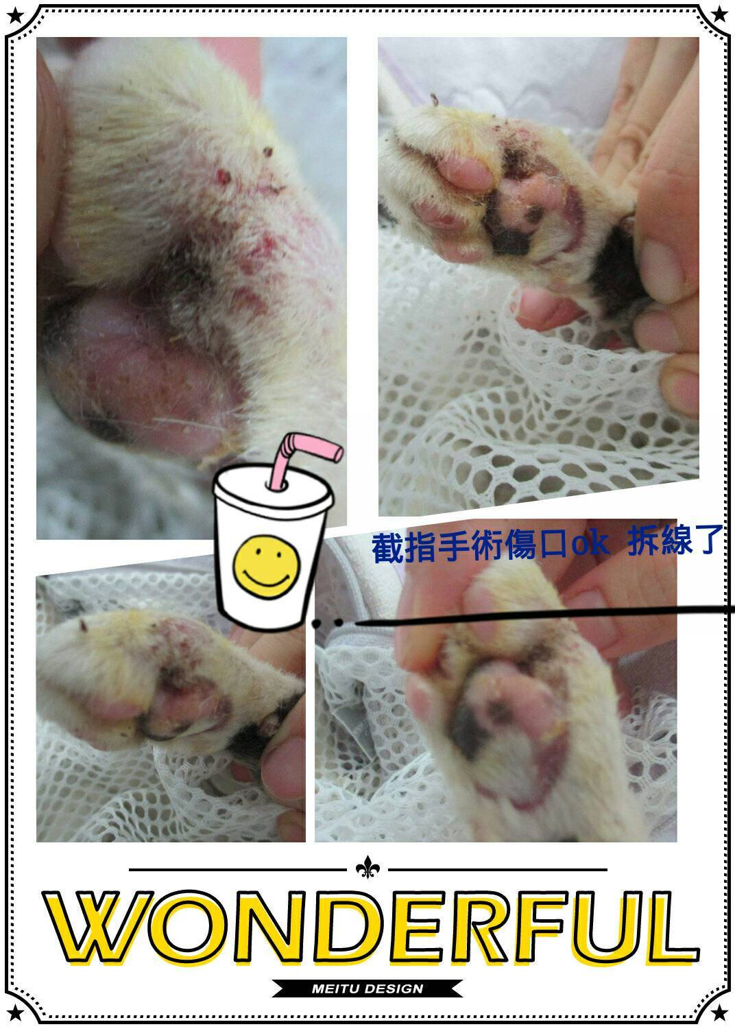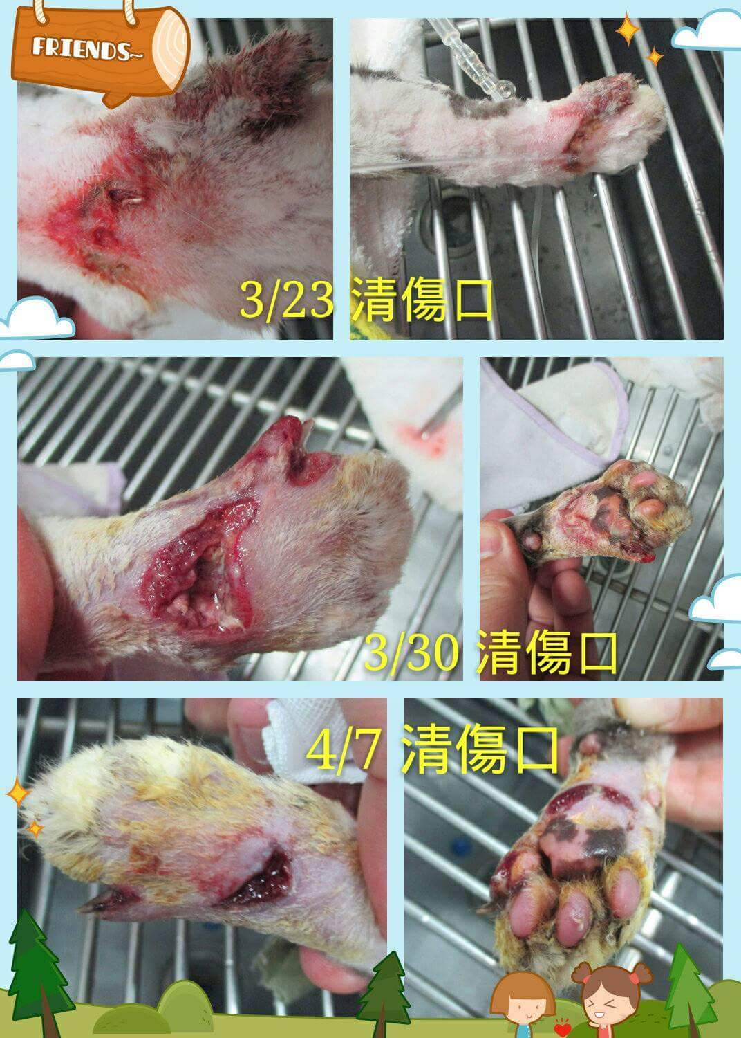 後續傷口狀況,感染及壞死區塊雖有變大,但腳腐敗的味道有減淡,傷口惡化狀況有趨緩,每日還是清創包紮照顧中, 一直到4/14一隻手指還是需要截指頭,手術完傷口ok拆線,出院了^^ 已通知動保處有到現場去拉布條,當地居民有餵食的會繼續注意狀況。感謝大家幫忙,貓咪的腳總算保住而且無大概,只截掉一個指頭,回去的隔天餵食的居民說貓咪有到她家門口吃東西^^