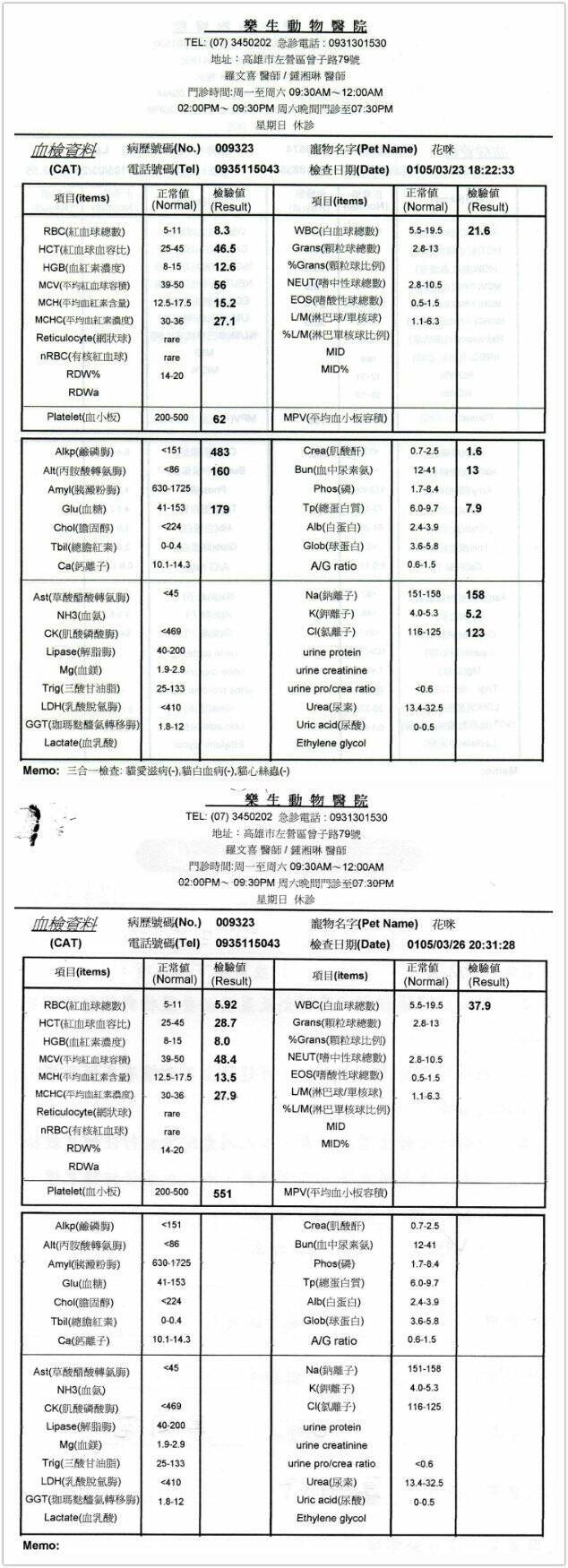 主題: 左營舊城 捕獸夾貓咪 申請者姓名: 劉素鳳 花色: 申請日期: 2016-05-14 08:59:02 申請者部落格: 申請者臉書網址: https://m.facebook.com/sufeng.liu?ref=bookmarks 所在縣市/合作醫院: 高雄市/樂生動物醫院 治療費用: 22600元 需求人數: 25人 已結案 (2024-06-01 13:36:16) 報名人員: Fg Jan(已付款)、Amily Hung(已付款)、Naommi x3(已付款)、王琇、奈奈、奈奈(已付款)、isa(已付款)、Bryant Lin(已付款)、Rui、Rui、老湯(已付款)、Alisa Huang(已付款)、zining(已付款)、林微利、王衣若(已付款)、廖小茜、廖小茜(已付款)、櫻花妹(已付款)、阿平(已付款)、Midori Yang、詩期(已付款)、Huan Feng Tz x2(已付款)、Lily Wu(已付款)、Yixiun(已付款)、Eric Chien(已付款)、Ray0322(已付款)、Jocelyn Chang(已付款)、李庭芝 x2(已付款)、Jasmine Lin(已付款)、 候補人員: 動物病情說明: 這是花咪,她是大約1-2年前我曾到此處紮過一堆貓咪的其中一隻,愛心餵食居民當時在補捉貓咪時認識的,突然接到她的緊急電話說有一隻貓早上才到她家門口吃飯,下午出現腳上就被夾住了。趕快前往網到貓咪趕緊送醫院,一開始到醫院,醫生先鎮定移除獸夾,並清傷口包紮及驗血,照X光檢查,驗血結果三合一(貓愛滋,白血,心絲蟲)都是陰性,但有發炎,脫水及肝指數過高,左邊第五指骨骨折,且指膚色呈現黑色,有可能會截指,醫生說先護理傷口視傷口狀況再決定是否須手術。