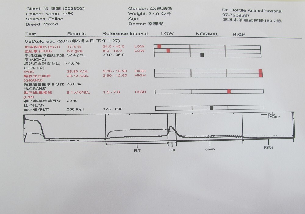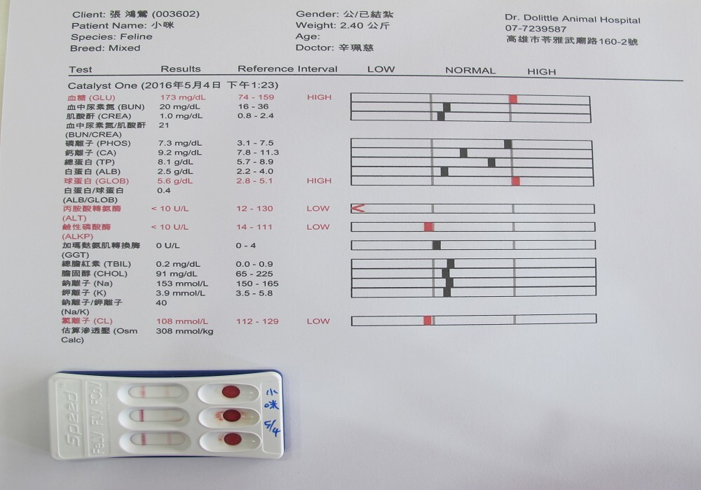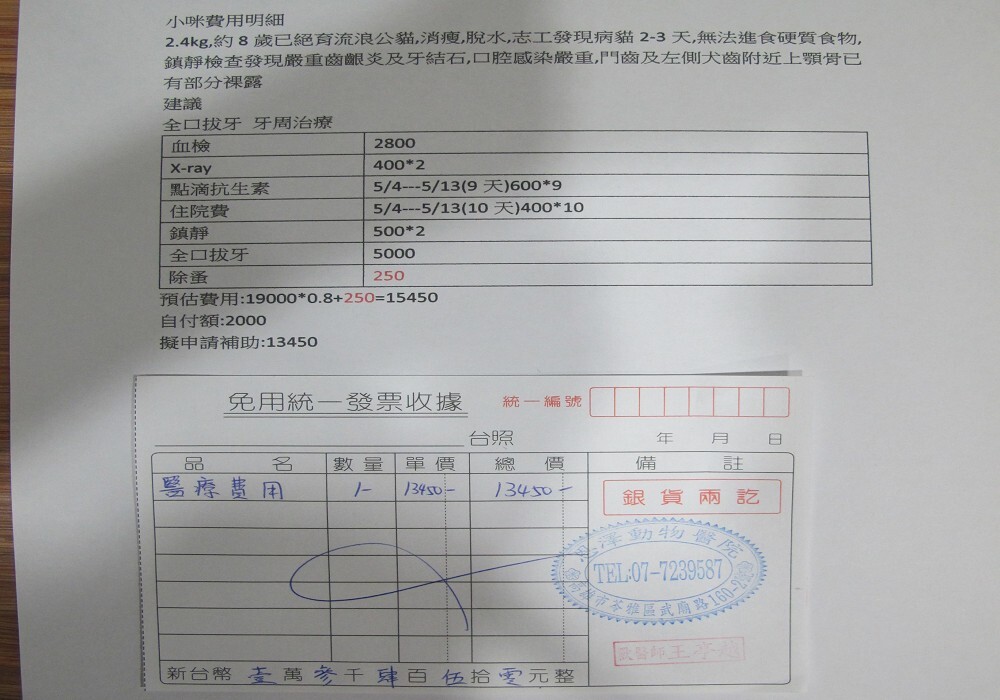 醫院建議:全口拔牙 牙周治療。動物近況說明: 小咪5/13出院後由我帶回家中療養,已能進食硬質食物,精神及食慾都很好!