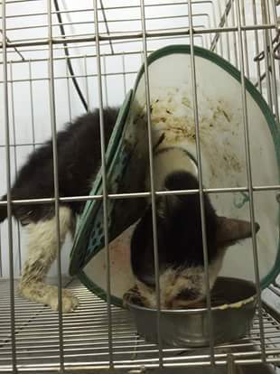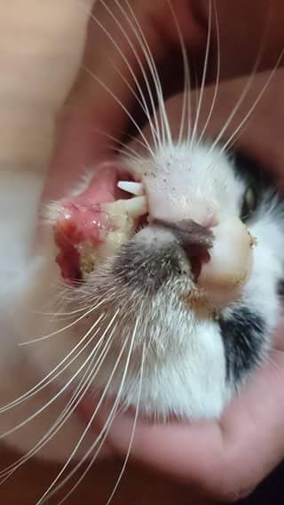 嘴嘴目前在桃園中途照顧(已經一個禮拜),適應良好,食慾暢旺,下顎潰爛部份,也開始長新肉了,目前體內外也已驅蟲,用三層籠隔離中,其他貓咪都已經可以接受嘴嘴的存在