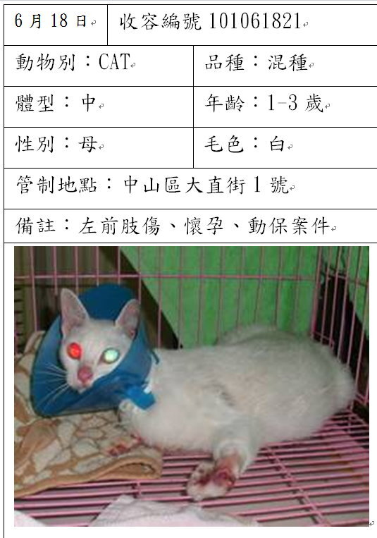主題: 大直街被捕獸夾夾到的白貓 申請者姓名: 蔡葦澄 花色: 申請日期: 2012-08-02 22:42:16 申請者部落格: 申請者臉書網址: 所在縣市/合作醫院: 新北市/成蹊動物醫院 治療費用: 19100元 需求人數: 24人 已結案 (2012-12-02 00:39:43) 報名人員: haramasa331(已付款)、張又懿(已付款)、Lynn(已付款)、Bella Chen(已付款)、Lucida Chen(已付款)、Grant Tsai(已付款)、Satine Yang(已付款)、Stacey Ma(已付款)、Phoebe Wen(已付款)、chiawei(已付款)、姚怪賢、姚怪賢(已付款)、Wei-wen Chang(已付款)、不不熊(已付款)、Ping Hussard(已付款)、Angelina Tsai(已付款)、Sandra Fu(已付款)、Viana Yin(已付款)、SKY(已付款)、Ming Hung(已付款)、小鬼娜娜好甜喔(已付款)、黎慶燕(已付款)、Hsu Vincent(已付款)、翅膀(已付款)、Timon Lu(已付款)、 候補人員: 小舟、小舟、 動物病情說明: 可憐的貓貓被捕獸夾夾傷,又懷有身孕,在收容所清創的時候因為疼痛而流產,帶出就醫時已經很虛弱,當日血檢白血球偏高,腳已發出腐敗的味道,很遺憾只能截肢保命,術後貓貓恢復狀況良好,為避免住院時感染其他疾病已下預防針,目前已出院在中途家靜養,醫療費用還請大家幫忙。謝謝! 動物近況說明: 潔白目前尚在中途姨姨家接受親人訓練http://www.facebook.com/profile.php?id=100003873901000&sk=photos_stream#!/photo.php?fbid=568105936538491&set=pb.100000172695533.-2207520000.1358225109&type=3&theater