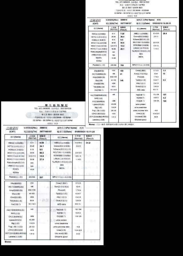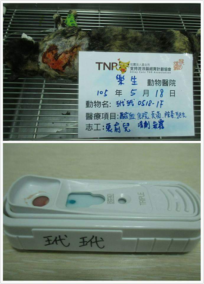 醫生說玳玳有5處嚴重外傷,口腔有口炎及齒齦炎且淋巴結腫大有打噴嚏的症狀,初步驗血有白血球過高及脫水,肝腎指數正常,目前已先鎮定清創並上點滴輸液給藥治療。