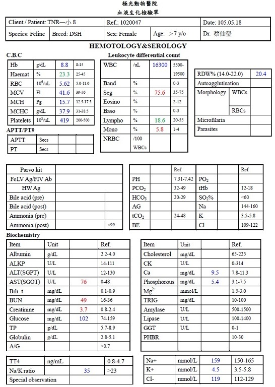小八上週血檢中的白血球數量遽增(發炎反應),