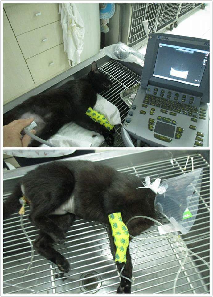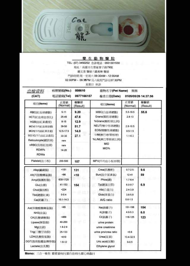醫生說熊熊檢查後膀胱過大且尿道堵塞無法排尿,初步已先導尿並輸液治療,驗血發現白血球及腎指數過高,且鉀離子也過高,顯示排尿受阻已影響到腎臟,X光檢查並無發現結石但超音波下檢查發現膀胱壁變厚有發炎的跡象,且有尿中有晶體,尿液會送驗做細菌培養。