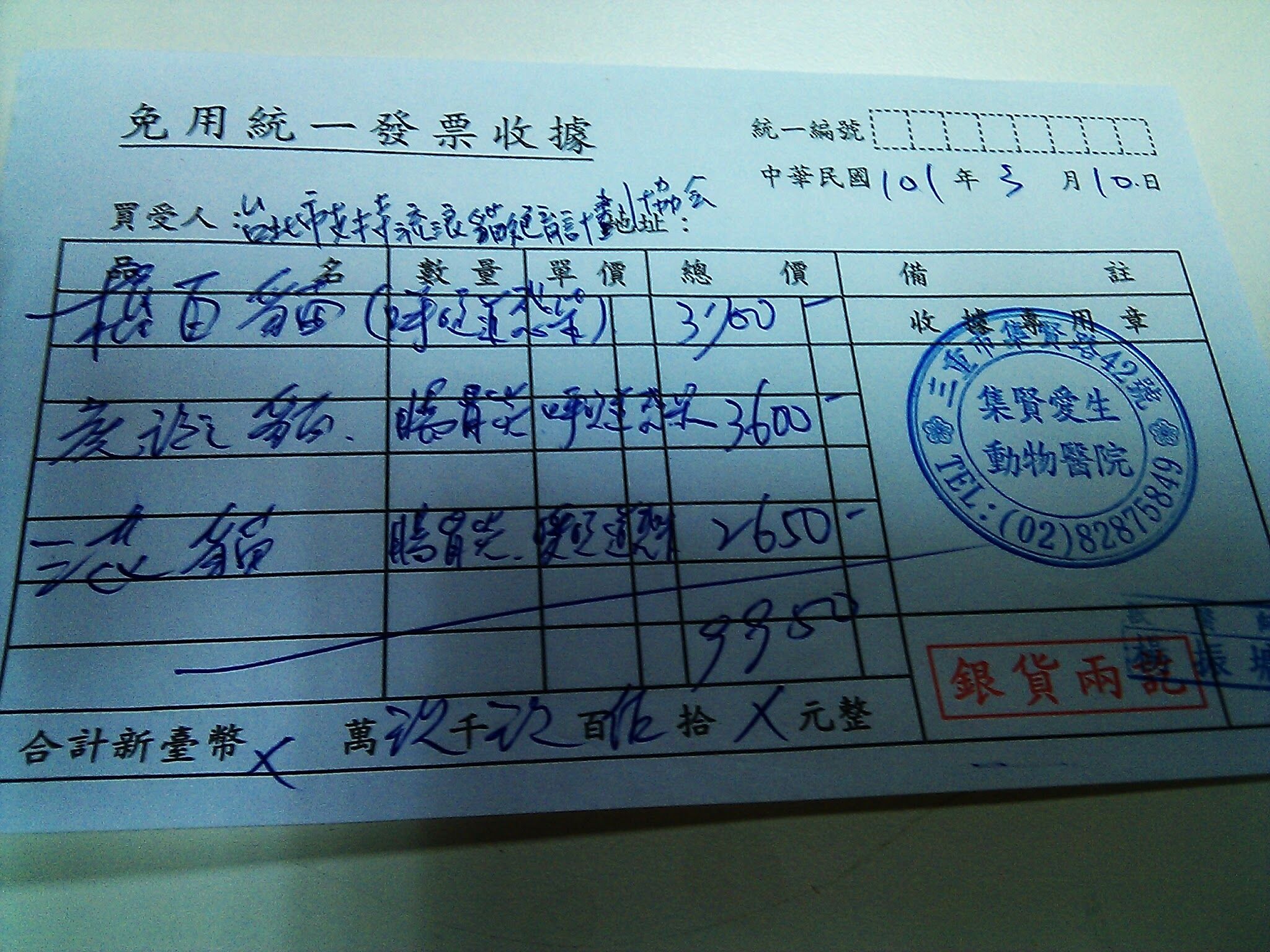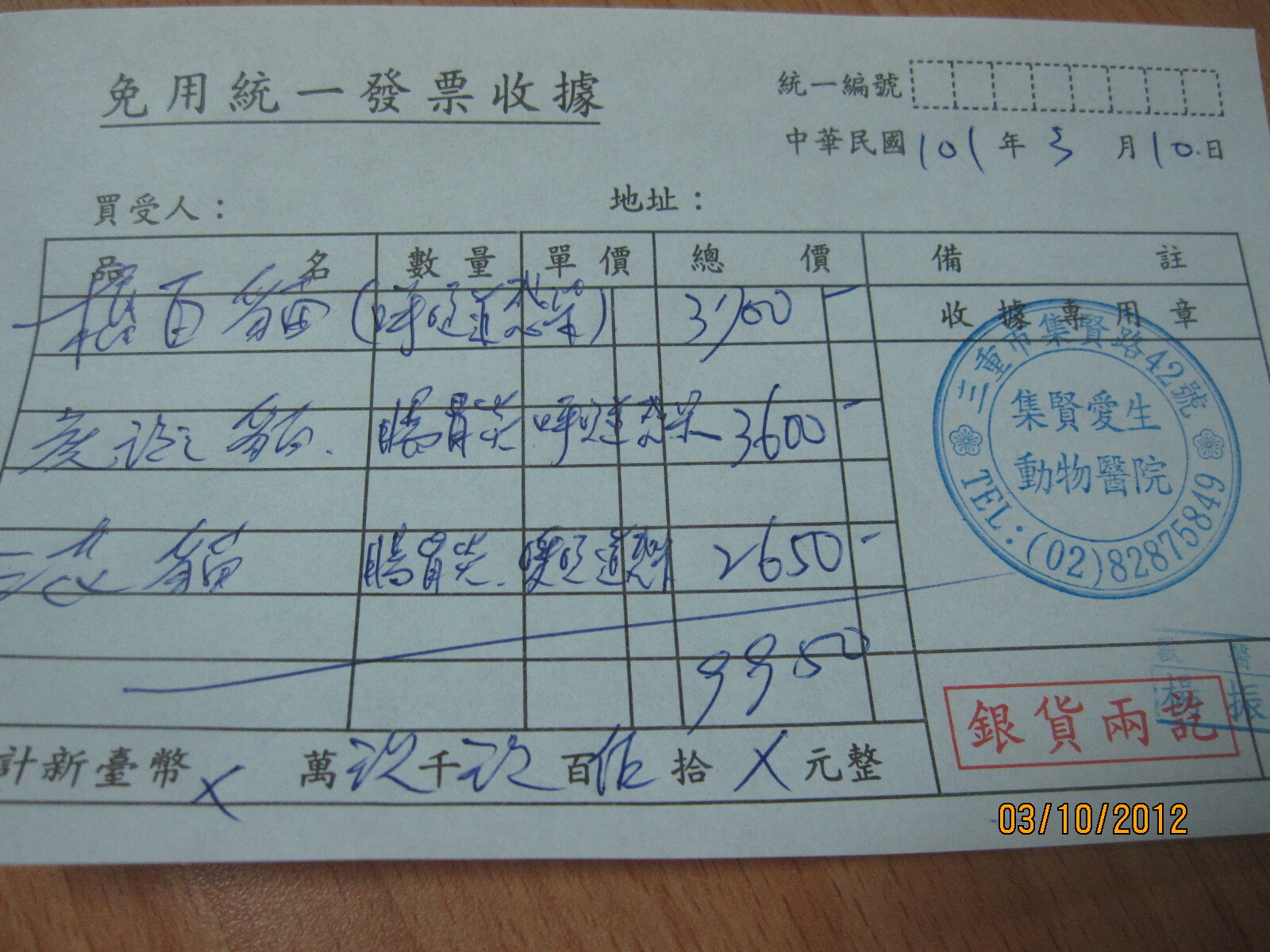 主題: 中途小貓數隻生病住院醫療 申請者姓名: 楊雅筑 花色: 申請日期: 2012-03-10 15:08:01 申請者部落格: 申請者臉書網址: 所在縣市/合作醫院: 新北市/集賢愛生 治療費用: 9950元 需求人數: 10人 已結案 (2012-03-16 01:19:29) 報名人員: 波波(已付款)、sally(已付款)、sally(已付款)、sally(已付款)、Lynn Cheng(已付款)、Lynn Cheng(已付款)、Jennifer Chung(已付款)、Amy H. T. Lin(已付款)、Katilin Chang(已付款)、julie lee(已付款)、 候補人員: 動物病情說明: (一)中途小貓狀況多