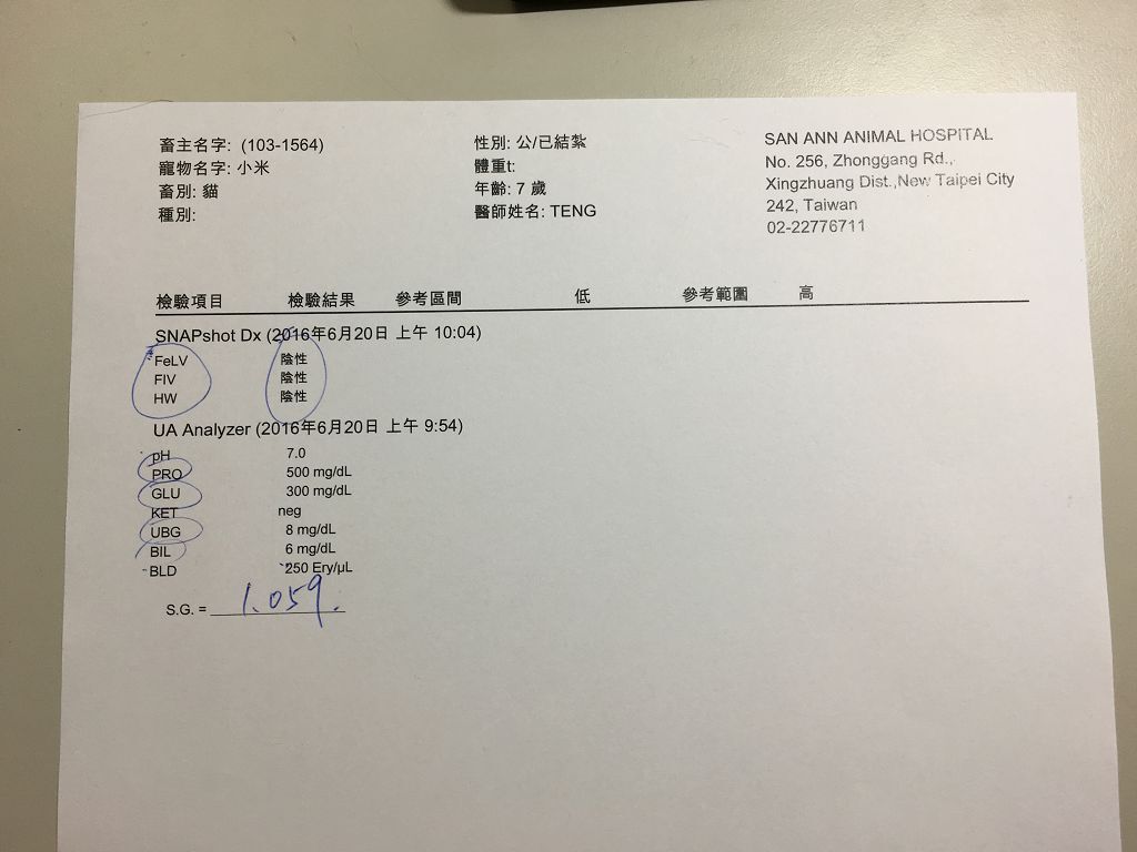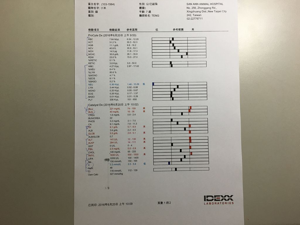 主題: 爬行浪貓小米 申請者姓名: 王曼玲 花色: 申請日期: 2016-07-15 23:33:11 申請者部落格: 無 申請者臉書網址: https://www.facebook.com/photo.php?fbid=1204538916224448&set=a.408321305846217.99054.100000050539764&type=3&theater 所在縣市/合作醫院: 新北市/聖安動物醫院 治療費用: 17870元 需求人數: 38人 已結案 (2024-06-01 13:35:05) 報名人員: Vickie(已付款)、Jasmine Lin x2(已付款)、Yumi Hung x2、Wenny Chen(已付款)、kc(已付款)、Yu Chung Li x2、長春路四面佛(已付款)、Wan Rung Teng(已付款)、Vita(已付款)、Ting Husan Chu(已付款)、Melody Cheng x2(已付款)、Piopio9(已付款)、Trista Kao、Phoebe Kuo(已付款)、薇薇安(已付款)、小可(已付款)、Yumi Ho x2(已付款)、栗栗(已付款)、Mark(已付款)、張俊哲 x2(已付款)、SHERRY、Lynn Wu x2(已付款)、Moni(已付款)、張承歡雙喜三寶(已付款)、Ian Huang(已付款)、Yen-Yuan Wang(已付款)、iris x2(已付款)、H.Iris(已付款)、Celia(已付款)、Rosalind Tsai(已付款)、Little Cat Chang(已付款)、hakumaio x2(已付款)、張三寶(已付款)、Kate Chang、渺渺(已付款)、牛牛(已付款)、 候補人員: 動物病情說明: 我在6/19下午在我家社區垃圾場發現小米窩在大型廢棄物的角落,發現他走路姿勢與正常貓不太一樣,且牠吃得極少,毛髮無光澤且身上有傷口,當下直覺需要抓他就醫,6/19晚上便徒手抓到他,並於6/20上午送醫治療.經由聖安動物醫院的滕醫師看診及檢查後,醫師表示小米身上及耳朵的外傷可能是皮膚病或是與貓打架造成的,且發現右後腳小腿與大腿連接處的韌帶斷掉,但仍有痛覺反應,瞳孔對光線無反應,不會正常縮放,至於小米會這麼虛弱的原因應是目前脫水且體溫偏低,還有血尿,其他的部分就要血檢確認指數是否有異常,初步血檢及尿檢後,醫師評估因為小米目前脫水及鉀離子異常,雖然報告上沒有貧血,但還不確定,白血球偏低,並疑似有糖尿病及胰臟炎,須等小米脫水狀況好轉後再重新驗血,數值才會較準確,才能判斷小米是甚麼疾病.6/24傍晚時醫生來電告知小米精神不濟,再做一次血檢後,發現小米停掉鉀離子的補充後,他的鉀離子又往下掉,同時白血球的指數也顯示小米身體有發炎,只是不知道何處發炎,因此除了需重新補充鉀離子,也開始施打抗生素,同時第二次尿檢發現小米的尿液比重很低,懷疑小米的腎臟功能有受損,下班後去看小米,醫生再幫小米掃了腎臟超音波及照X光,醫生表示小米的腎臟構造異常,可能需要轉院做更進一步的檢查,因為醫院現有的設備無法提供更精密的檢查.因此經過周末兩天詢問其他配合之動物醫院後,6/27原定要讓小米轉院,但因為小米當天的狀況又穩定下來,故暫時不轉院,只是紅血球的指數仍偏低,懷疑腎臟已無造血功能,當天施打一劑造血針.6/29去看小米,摸摸小米會喵喵叫了,但似乎有些害怕,醫生表示小米狀況有比較穩定,比較有自己進食,待觀察小米可以自己吃飯後,要再次血檢確認鉀離子的濃度,若可以完全自己進食就可以停掉點滴.7/1去看小米,一樣摸摸就會喵喵叫,體力感覺好很多,但是毛髮還是髒髒的,似乎還不太自己理毛.7/2醫生表示抗生素的療程今天是最後一劑,已經可以自己吃飯,但建議還是要帶小米去台大或長青掃超音波,請醫生協助預約7/8帶小米去台大掃超音波,因當天颱風假取消. 動物近況說明: 小米已於7/9晚上出院,目前由我自費委託中途協助照顧,恢復狀況還不錯,並於7/15至台大動物醫院掃超音波.關於小米腎臟功能的部分,需再與醫生討論後續的治療方式.小米於7/20因為從早到晚嘔吐了4次,飯前飯後都有吐,因此再次回診血檢及打止吐針,血檢結果顯示之前施打的造血針及倍補血已讓小米改善貧血的狀況,但可能小米因為腸胃敏感,可能因為換食而導致嘔吐,此部分會再持續觀察.同時7/20也已經自付之前住院的部分費用10000元,剩餘金額為17870元,懇請協會及社會大眾幫忙,謝謝.