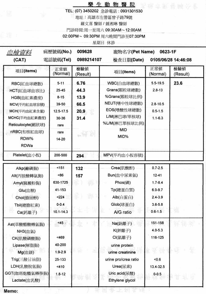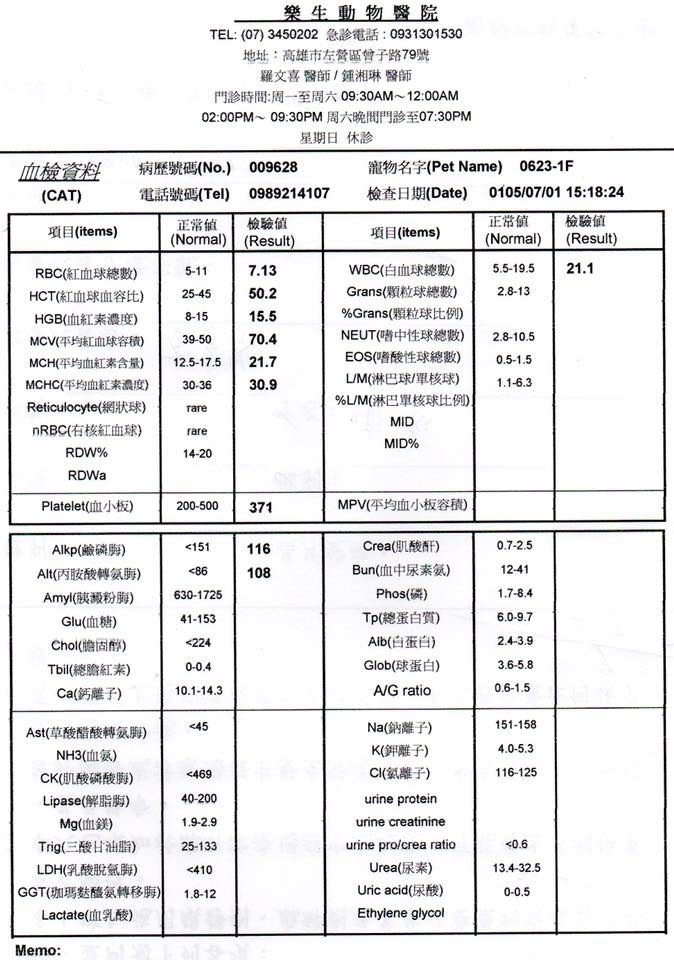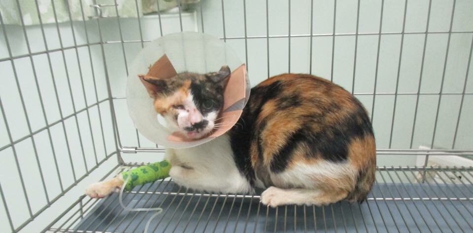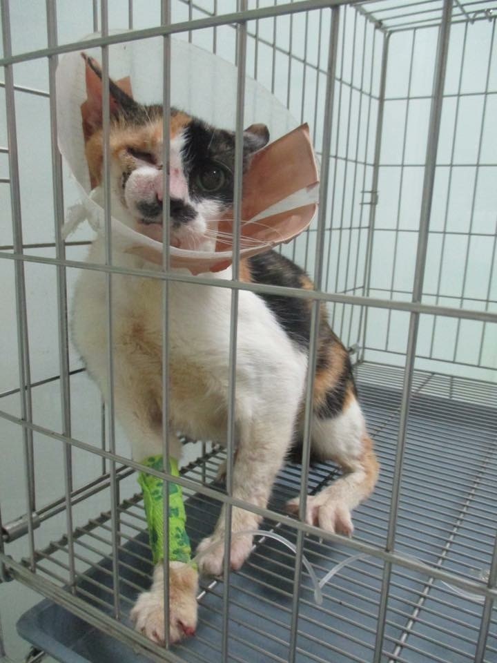 主題: 可憐小貓被打死的母貓媽媽多處傷痕累累 申請者姓名: 謝一如 花色: 申請日期: 2016-07-23 01:42:24 申請者部落格: 沒有部落格 申請者臉書網址: https://www.facebook.com/permalink.php?story_fbid=10205528857895511&id=1673807215 所在縣市/合作醫院: 高雄市/樂生動物醫院 治療費用: 14800元 需求人數: 33人 已結案 (2024-06-01 13:34:49) 報名人員: 潘芭比(已付款)、Miuo(已付款)、Amber Lin(已付款)、翊小榛(已付款)、梁仕宏(已付款)、張球(已付款)、Mandy Chen(已付款)、Minerva Ma(已付款)、Hedy Liu(已付款)、Juoshi Wu(已付款)、小不點 x2、Zankana Wang(已付款)、娟(已付款)、bluedidi(已付款)、Chris Huang(已付款)、Huey x2(已付款)、De Von、白宇扉(已付款)、Ray0322(已付款)、Tina Li、吉咪爺爺(已付款)、billcat(已付款)、吱吱(已付款)、Lori Chao x2(已付款)、郭庭甄(已付款)、郭庭甄(已付款)、Ken x4(已付款)、ChendiOccult(已付款)、紅花 x2(已付款)、BELLA CHEN(已付款)、 候補人員: 動物病情說明: 高雄廣播電台隔壁的游泳池後面巷子很多貓、聽小攤販說、這隻母貓每天都在哭叫、原來是她的孩子被打死了(一窩4隻)她因為不親人而逃過一劫但是依舊傷痕累累。不忍她受苦又拖著受傷的身體覓食、怕她又再懷孕於是誘捕要結紮、意外發現她的眼睛再不送醫就沒有救了...皮膚還紅腫發炎、外觀有嚴重分泌物...應該是感冒了! 動物近況說明: 穩定後上唇受傷缺一角,受傷部位通到左上眼結膜,吃藥及點眼藥後,目前膿樣分泌物已減少,但是要手術處理,有手術及照顧難度,此貓很兇,手術後,可能無法照顧傷口,醫生告知傾向不動刀,
