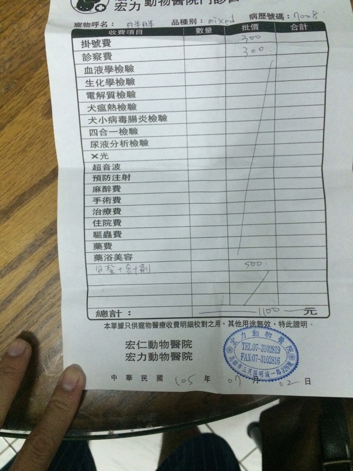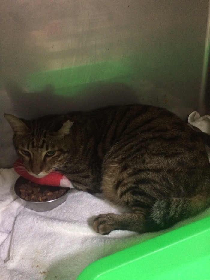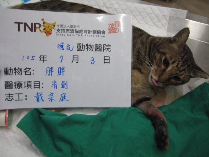 7/18胖胖今天已接回R回,狀況目前正常動物近況說明: 今天醫生告知胖胖的傷口復原良好已拆線,而且傷口已結痂,所以我今天下班之後就去接胖胖回來原地持續餵養,胖胖的醫藥費用一共是9900,我已先