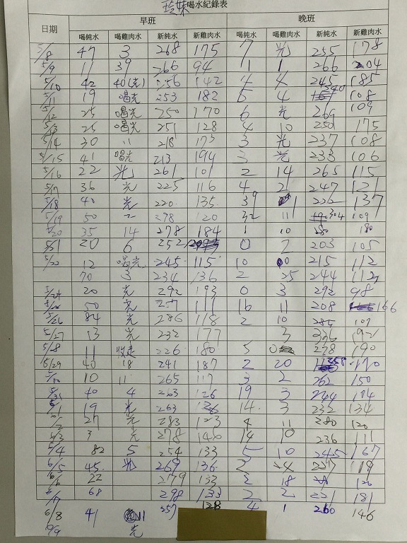 照護人員也會每天記錄玲妹一整天的飲水量,