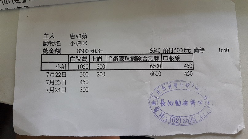所以先將爆眼小虎貓帶回家照顧至7/22入院開刀摘除右眼