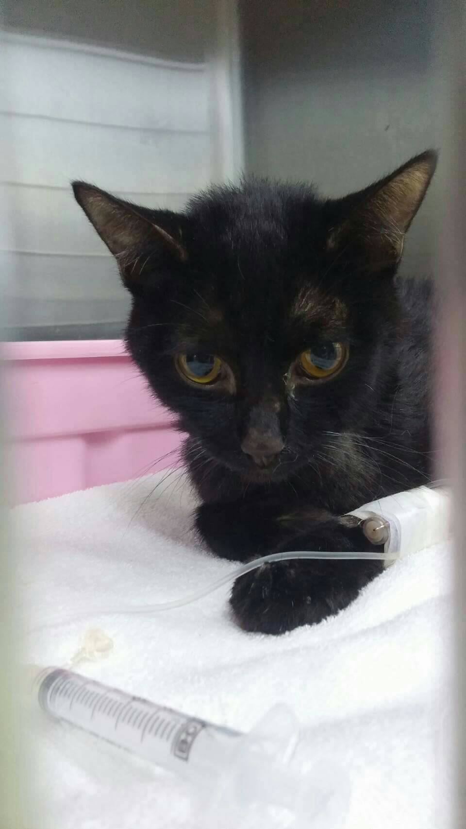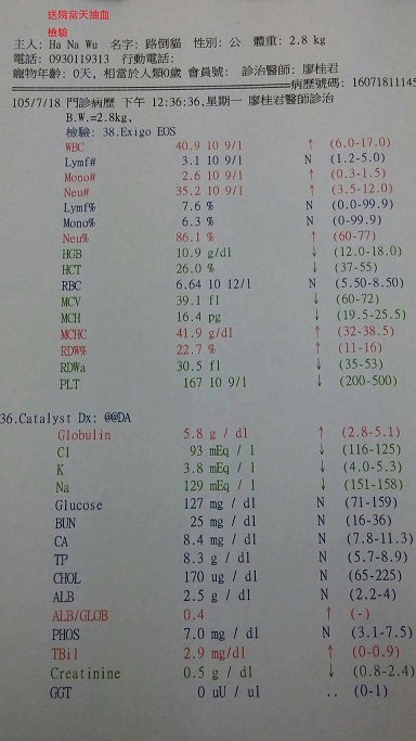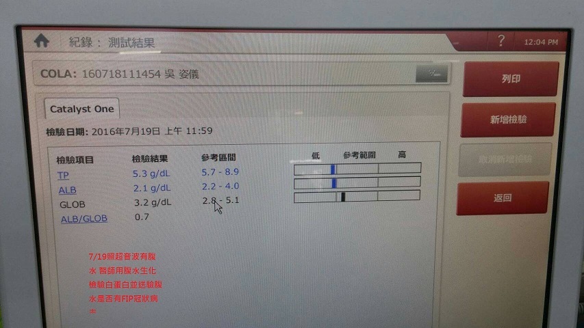 動物近況說明: 7/19到院看視時 醫師說孩子有癲癇症狀產生 發作頻率平均15分鐘一次 發作時間10-15秒 腹部似乎有些許異樣 醫師照了超音波 有抽出一些腹水作生化檢驗 但尚不知是否為傳染性腹膜炎 所以送件檢驗 因血糖持續降低 癲癇一直發作 無法灌食 醫師只能先給予少許鎮定劑 讓孩子休息 才不會因持續發作 造成心臟.神經等身體負荷