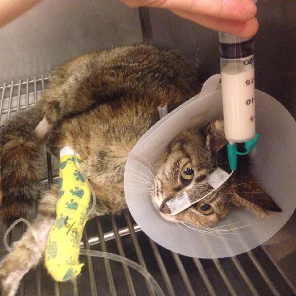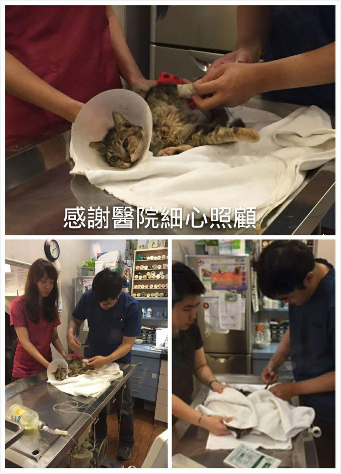 我本身怕貓,只餵,不敢抓。我求助,後來朋友上網問到並找了人幫忙抓到牠.動物近況說明: 痛痛到院時,身體狀況已經不太好,醫生評估貓咪狀況,要先打強心針隔天手術比較安全。