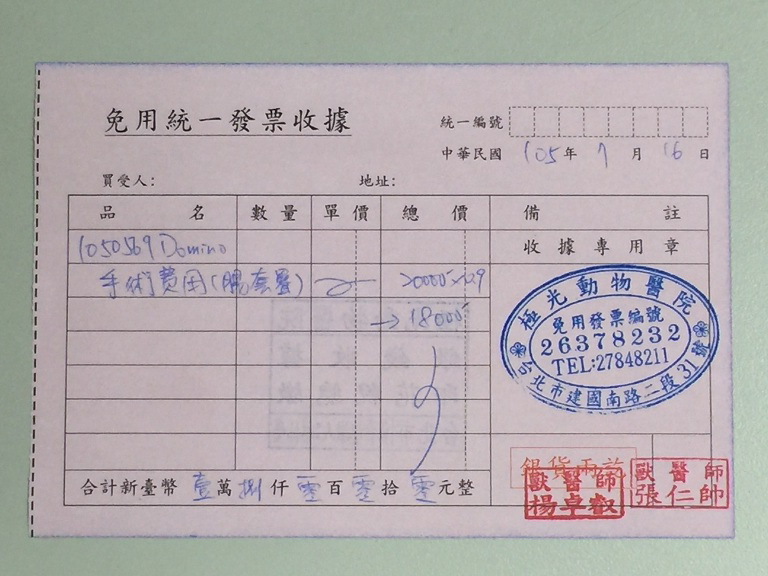 主題: 動腸套疊手術的Domino 申請者姓名: 臺北市支持流浪貓絕育計劃協會 花色: 申請日期: 2016-07-27 17:05:10 申請者部落格: 申請者臉書網址: 所在縣市/合作醫院: 台北市/其他院所醫助專案(醫院請先MAIL溝通) 治療費用: 18000元 需求人數: 39人 已結案 (2016-12-22 01:50:24) 報名人員: Candice Chao(已付款)、以四面佛名義 x2(已付款)、彭壯雲(已付款)、Kate Chou(已付款)、吳璇、Laianna Yan(已付款)、Joanne Chang(已付款)、Ting Husan Chu(已付款)、ViVi x2(已付款)、Stephie Lin x2(已付款)、Angela Wang(已付款)、Fanfan(已付款)、佩玲佩玲(已付款)、Timothy Hsu(已付款)、Timothy Hsu x10(已付款)、汪杏筠(已付款)、周周(已付款)、Eleen(已付款)、fangyu(已付款)、Erin Lin(已付款)、PeiPei Lee(已付款)、Ting Smile、Watery Luo(已付款)、師婉豬 x2(已付款)、希希 x2(已付款)、張承歡(已付款)、Kate Chang、點點(已付款)、 候補人員: 動物病情說明: Domino是隻可愛的黑白小貓,