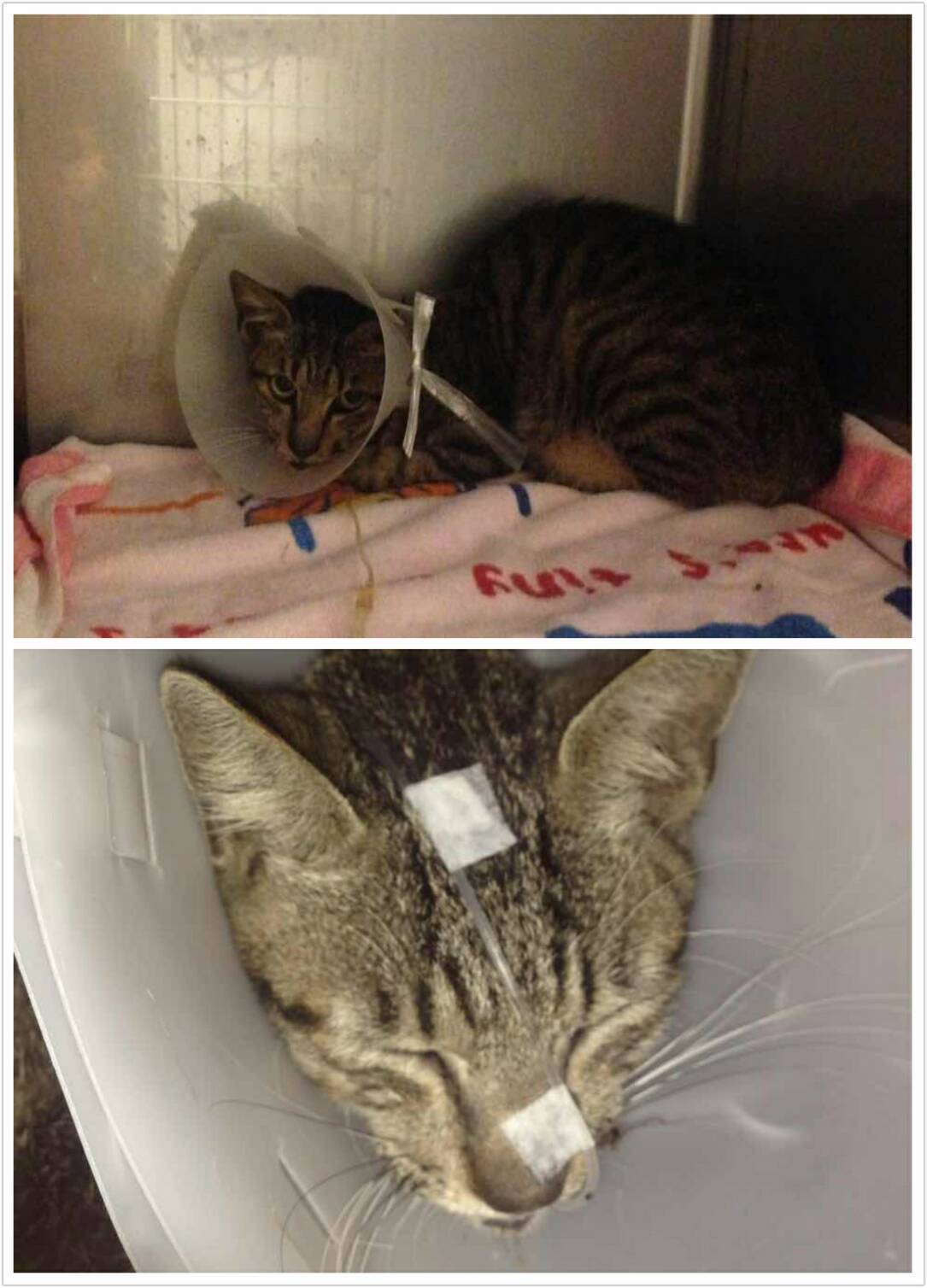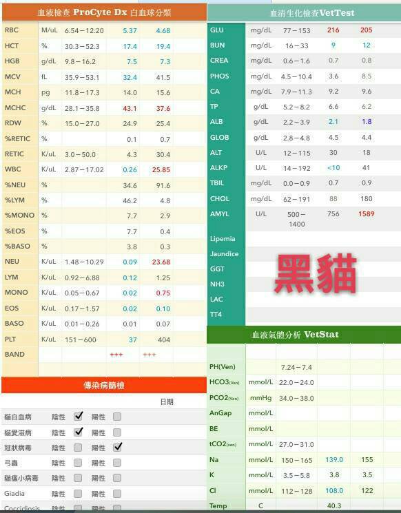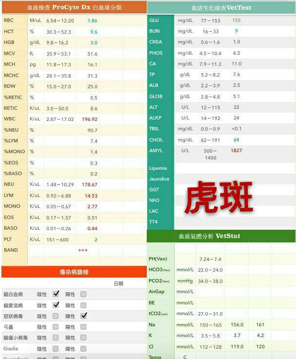 醫生說虎斑,白球沒有天理的超級高!極嚴重的貧血!已經有嚴重性敗血症。低血壓,住加護病房治療。三合一檢查,FIP陽性,所以很明顯是有 卡利希病毒、傳染性腹炎二種病毒的混合感染. 聽起來很嚴重。 兩隻貓的口腔有潰爛和口炎,貓咪不吃 醫生有裝設了鼻餵管,三合一檢查 2隻冠狀病毒都呈現陽性動物近況說明: 虎斑貓口腔檢查有潰瘍,裝設鼻餵管開始灌食的隔天緊急說要輸血,我到處問有沒有人有貓可以來輸血,後來醫生說來不及>< 貓咪過世了當天使去了