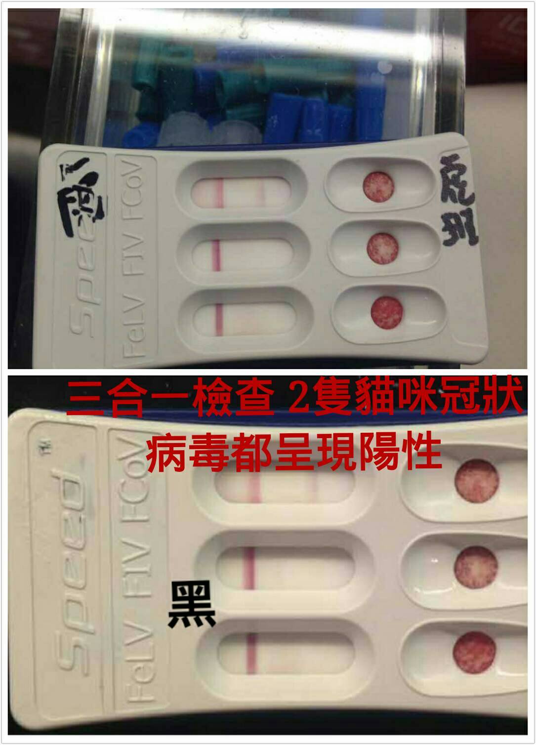 三合一檢查,FIP陽性,所以很有可能是有 卡利希病毒、傳染性腹炎、及錨瘟三種病毒的混合感染..