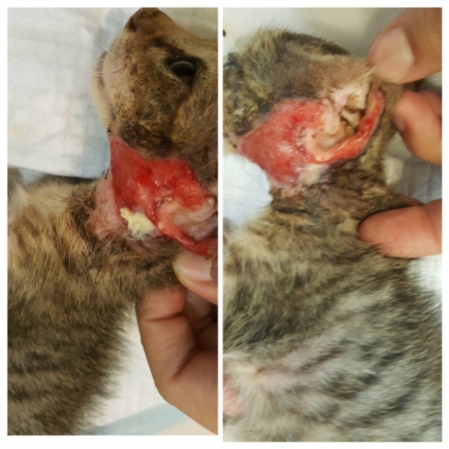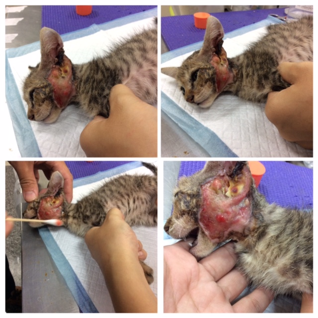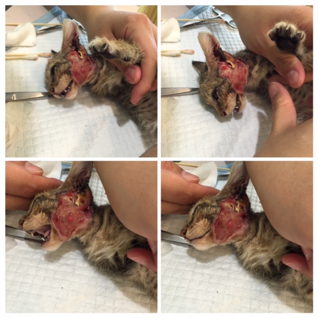 醫師幫小貓剃毛後發現臉上沒大的開放性傷口或咬傷,不過下巴跟左側臉頰有明顯紅腫,針吸抽取膿液,耳朵內也有感染,感染範圍很大,佔全身約1/10的面積。需吊菌檢查是何種細菌感染,目前先用第二線抗生素治療。