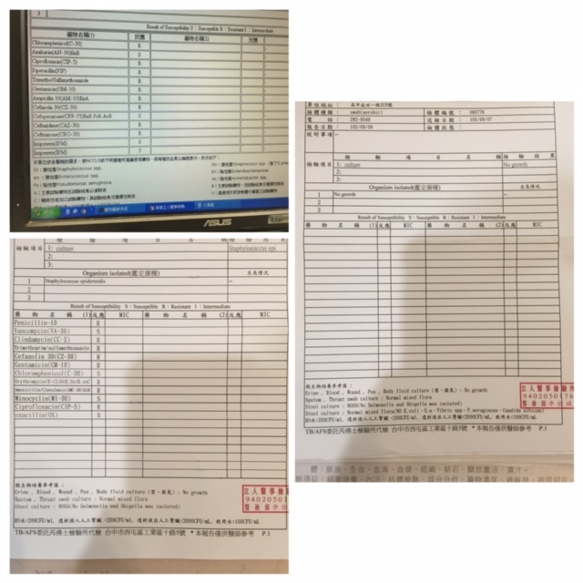 傷口癒合不錯,第二次吊菌結果發現的細菌跟第一次不同,但能用的藥一樣少,只能維持同樣的抗生素治療。