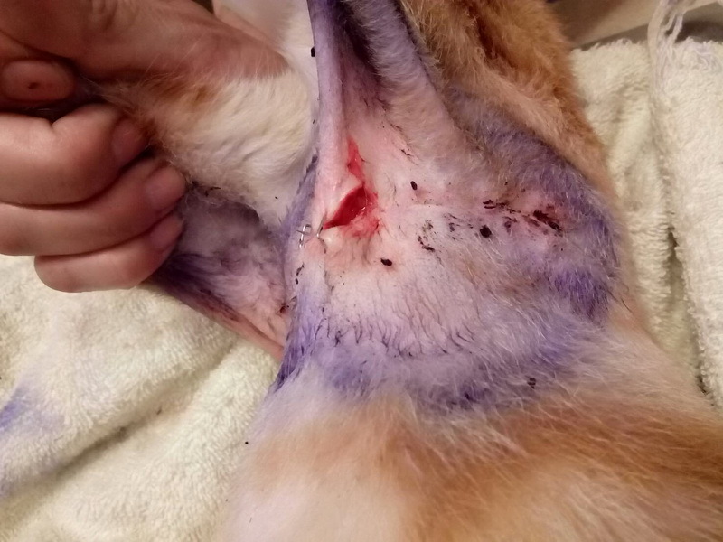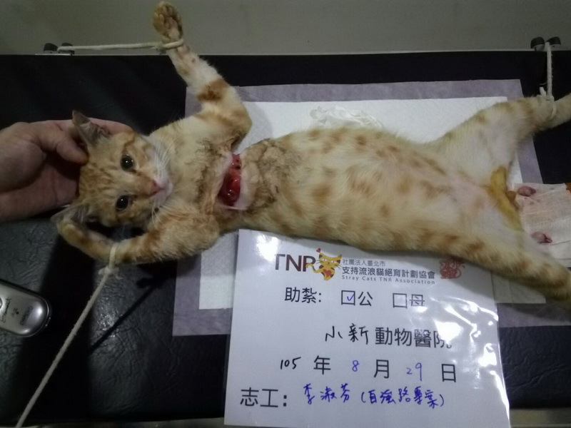 一共抓了27隻,一切狀況還算順利,8月29日中午小新鍾醫生致電給我說稍早送去的那批裡有隻橘貓胸口有很大的傷口,研判是橡皮筋造成的,橡皮筋斷掉所以背部傷口有癒合,但胸口因趴著感染所以整個開始潰爛,醫師說血檢有愛滋,白血病那邊也有淡淡的一條線,所以應該兩種都有,血檢的部分就是有貧血,其他生化指數是還好,一切都很謝天謝地,大橘沒敗血,還好有救到他!