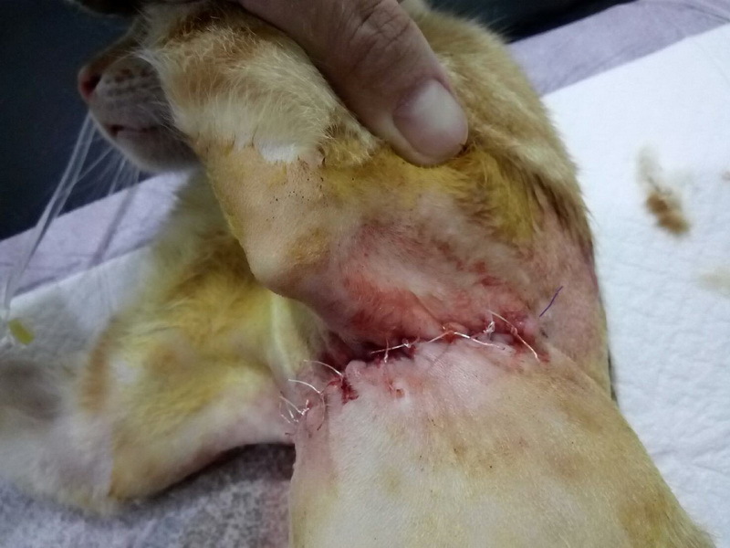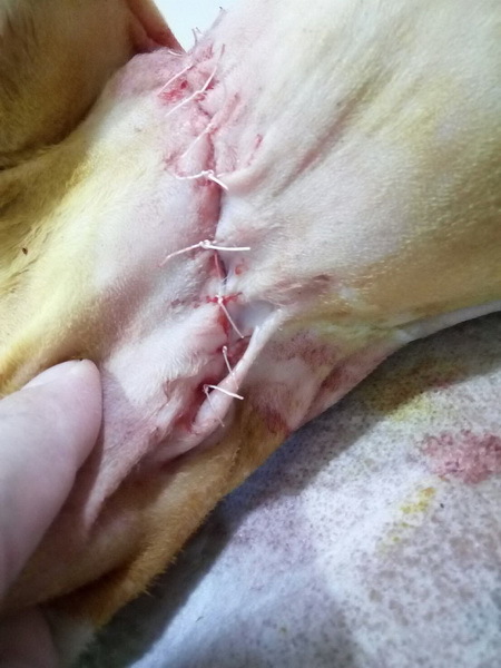 邱霖經過3次清創縫合,由於他有愛滋和白血,所以導致傷口癒合很慢,加上傷口又在胸腔,只要一動作傷口就很容易爆開,又兇,讓醫生很頭疼,還好在鐘醫師的細心耐心治療下,邱霖有康復,傷口終於癒合了!動物近況說明: 邱霖因太兇,在住院這段期間有想過幫她做親人訓練,但最後還是失敗,所以還是讓她回原生地了,原生地的餵養人看到邱霖回去也很開心,還特地開罐罐幫他補補身子