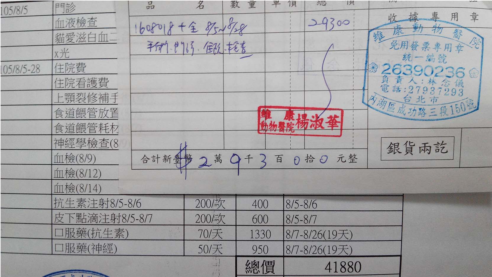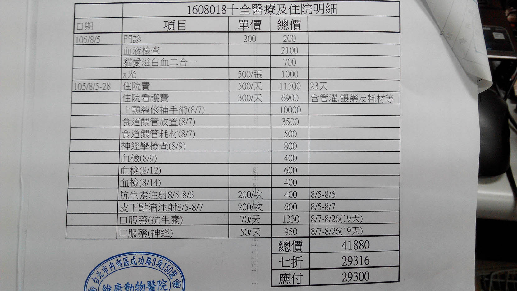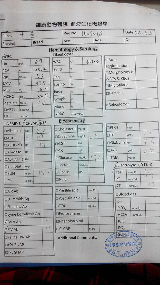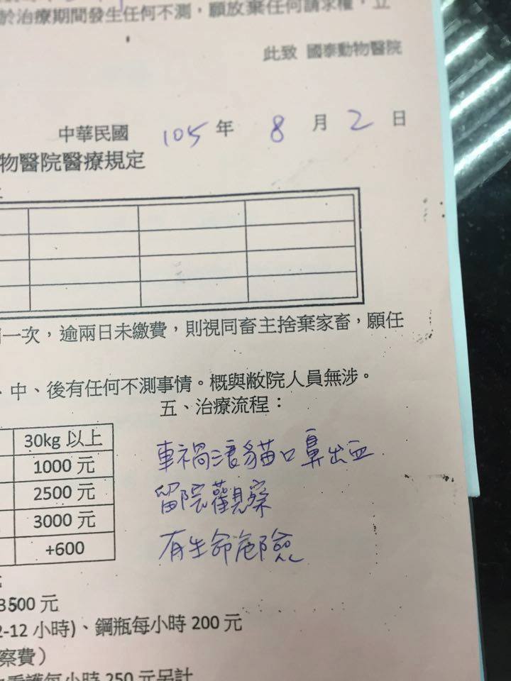 今天藉由善心人的介紹,聯絡上了能夠幫忙的團體:TNR協會,他們提供了合作的醫院給我們,稍早之前已經向國泰動物醫院詢問過十全狀況,院方表示十全狀況穩定可以轉院,所以5號早上我就會帶十全轉到內湖維康動物醫院,謝謝國泰的醫師護士這幾天的照顧。