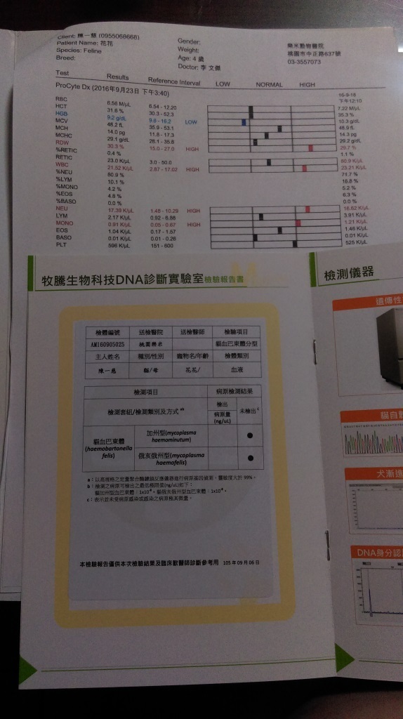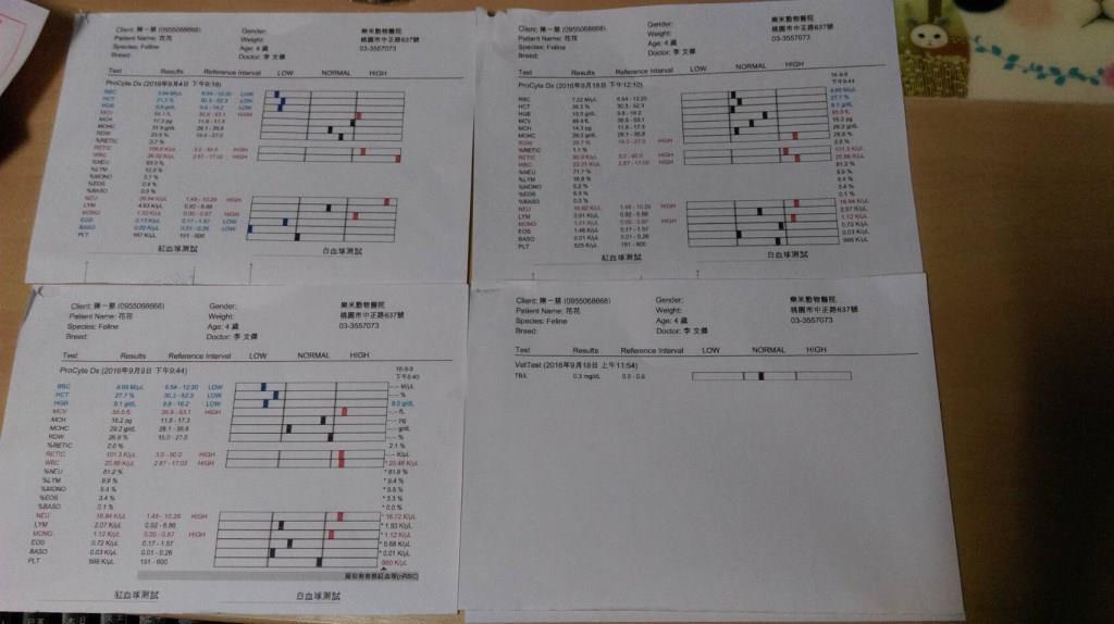 10/4 回診有再次做血檢,第一次貧血及白血球數值皆為標準值以內,甚至是之前多次血檢其他有略高的指數,但因為還有持續流口水的現象,故醫生有再開嘴觀察他口內之前發炎跟潰瘍的情況,並發現未拔的上下四顆犬齒牙齦處仍有紅腫甚至是潰瘍,口腔已拔掉牙的位置看起來都比較沒有紅腫的現象,醫生表示若有此情形可能考慮需再將最後上下四顆全數拔除,並說明拔犬齒手術較複雜,故術後需觀察是否有感染(牙齒通至鼻腔處),最好需住院3-5天點滴,建議考慮做犬齒拔除手術。