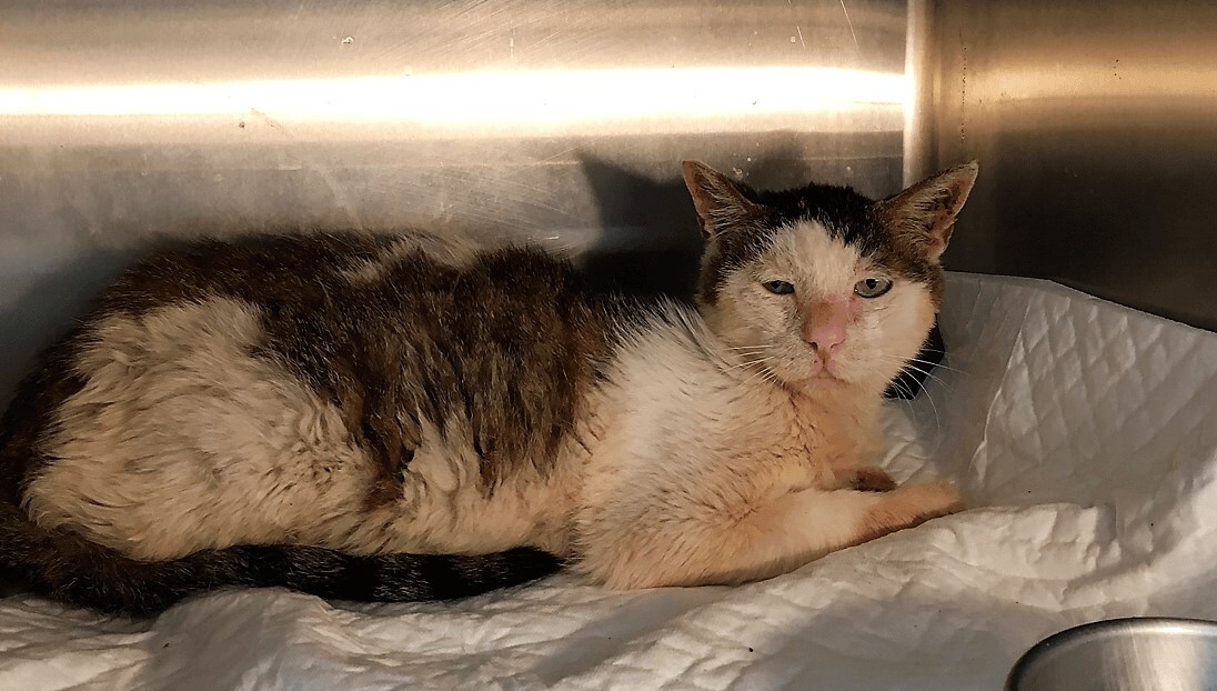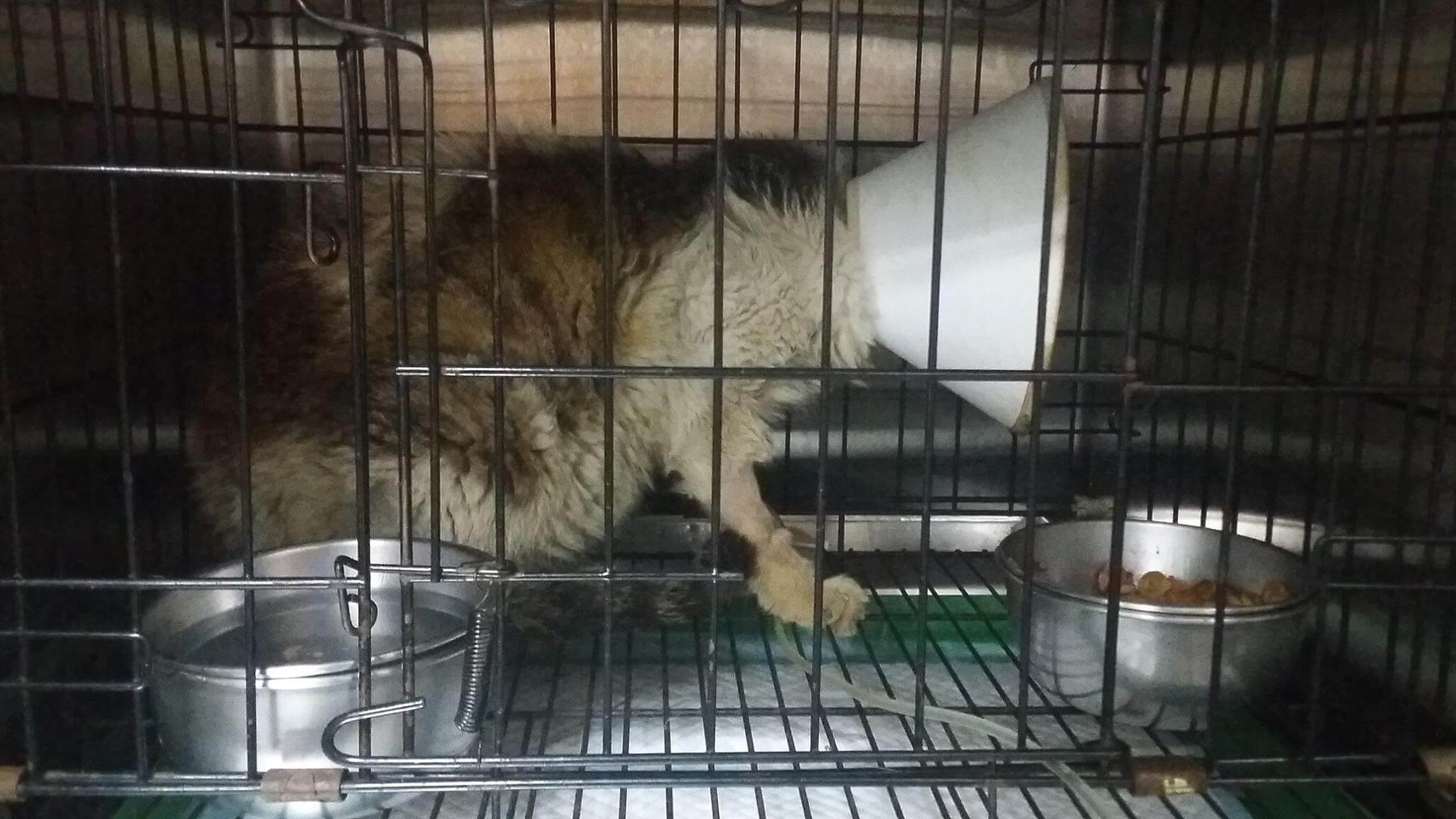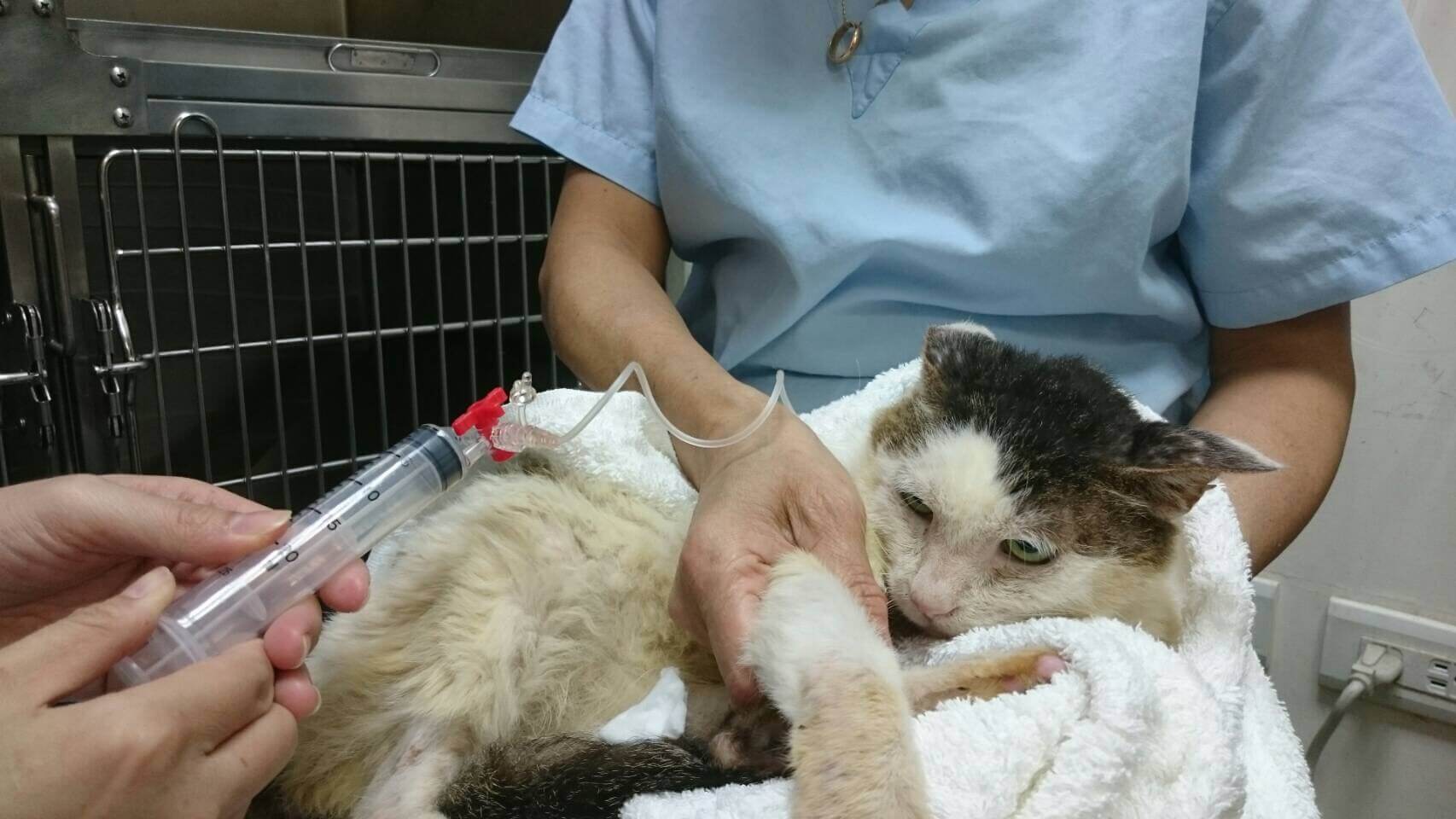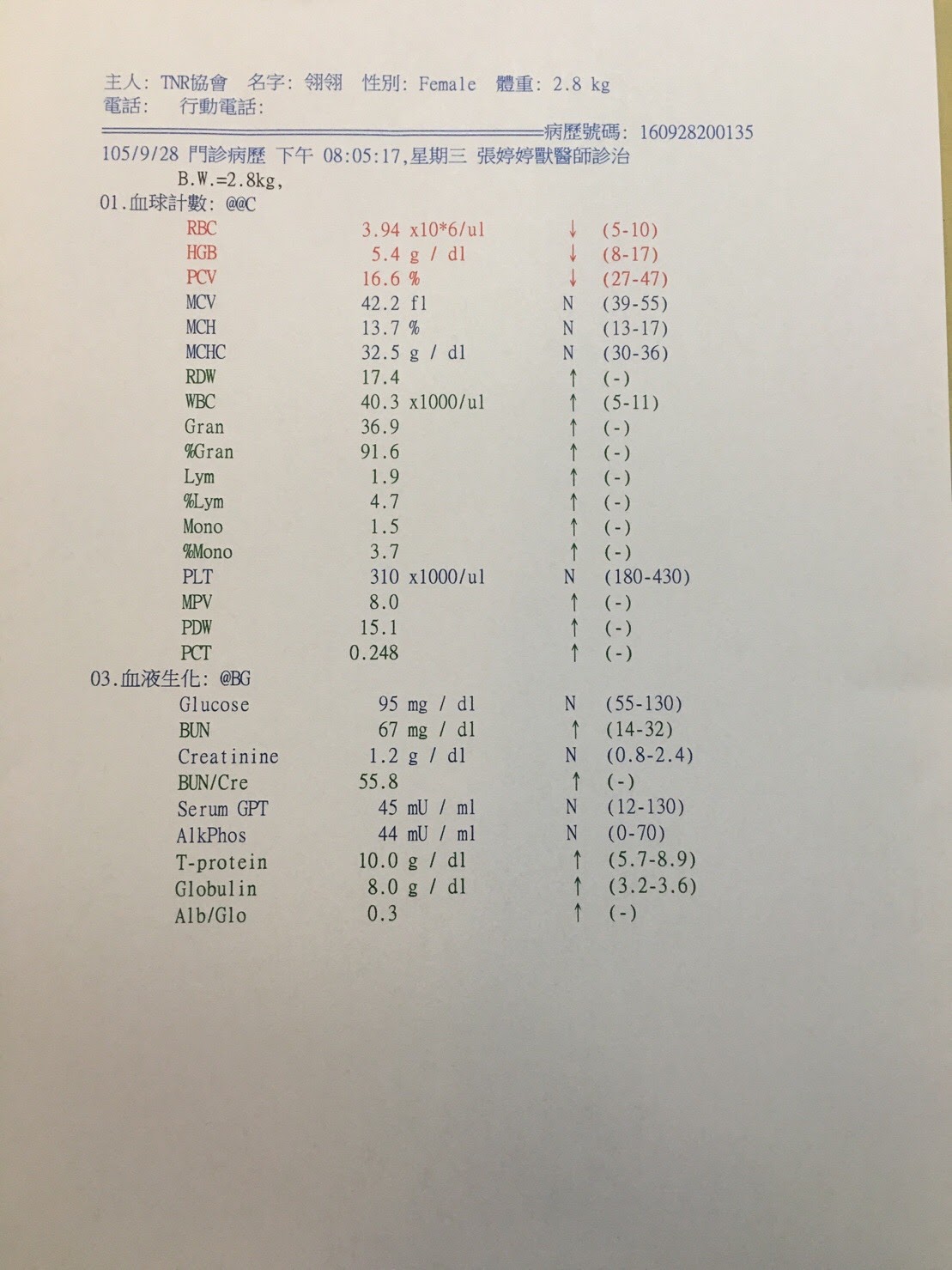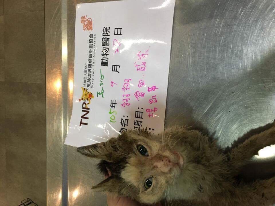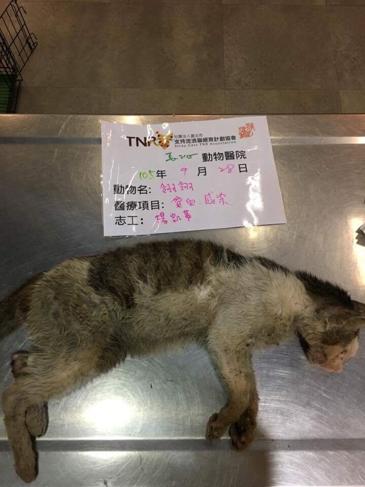 105/09/28老貓翎翎有身形瘦弱,全身毛髮髒亂的情況,與其他街貓相比差很多。通報就醫後,檢驗結果顯示白血球超標,已罹患「血巴東」(貓咪的貧血症),必須住院觀察,注射抗生素治療。