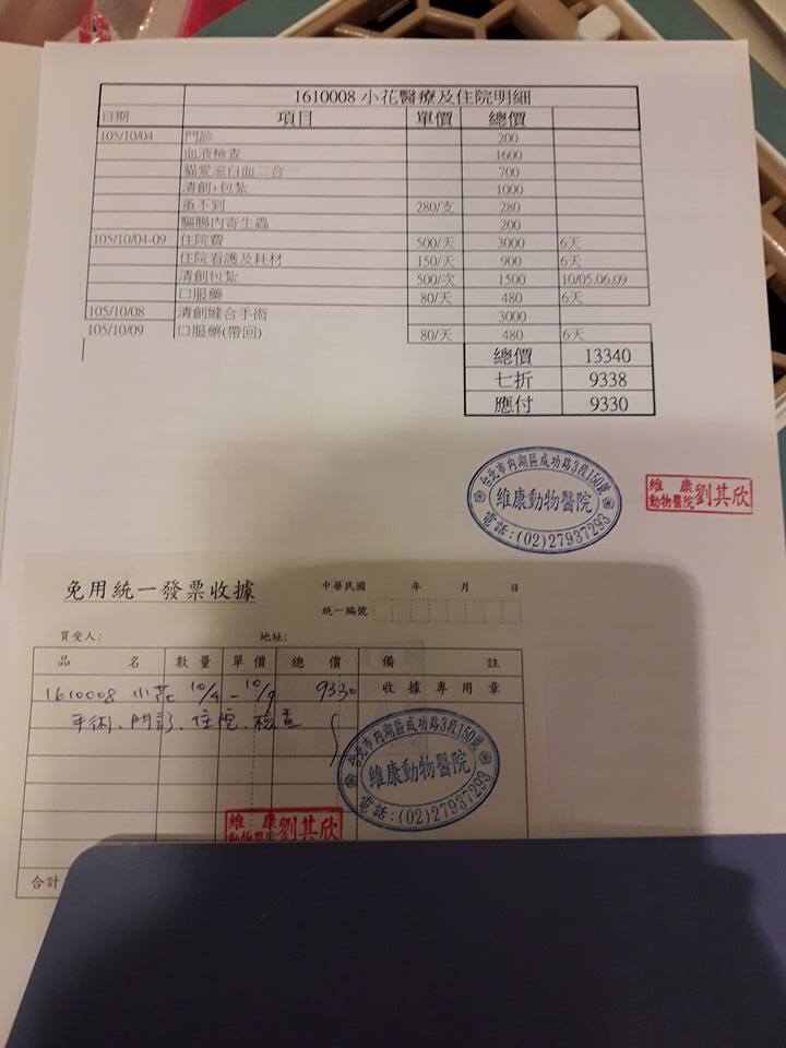 愛媽已自付回診及拆線醫療費用共1500元