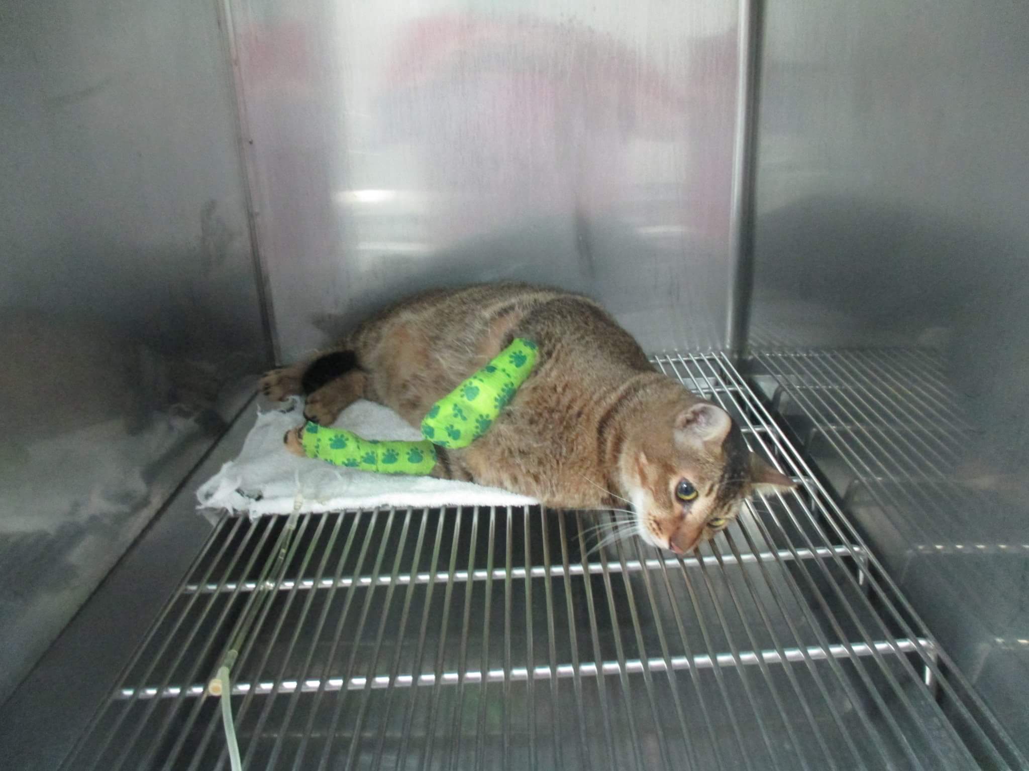 幾天前不見牠,有些詭異,因牠是不會亂跑的貓,每天都只要我下樓一定出來找我,再次出現時,見牠掰腳且旋空,不敢踏到地上,手2,掌腫脹到看不到指縫……