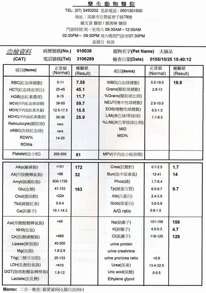 主題: 前肢無故腫大的貓咪 申請者姓名: 張海蒂 花色: 申請日期: 2016-11-11 01:43:25 申請者部落格: 申請者臉書網址: https://www.facebook.com/profile.php?id=100002528483590&soft=requests 所在縣市/合作醫院: 高雄市/樂生動物醫院 治療費用: 7300元 需求人數: 16人 已結案 (2022-05-13 15:21:23) 報名人員: 宥宥(已付款)、Jessica Hsu(已付款)、麻糬 x2(已付款)、點點 x2(已付款)、王小盈(已付款)、LR(已付款)、蔡宜志(已付款)、奈吉(已付款)、Queenie Chang(已付款)、Hayato Chen(已付款)、Kuo Wei x4、April Tsung(已付款)、tigercat(已付款)、shirley109(已付款)、恩客(已付款)、 候補人員: 動物病情說明: 大摳呆是生活在我家地下室的浪貓,平日有我的餵食與照顧,且已結紮,心想能安穩的過個幾年沒問題,鄰居住戶雖然不是很滿意,但還不至於通報防疫所來捉。
