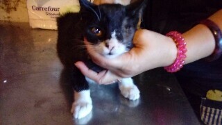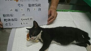 主題: 菜市場旁土地公廟左眼嚴重潰爛的賓士貓 申請者姓名: 黃意如 花色: 申請日期: 2016-11-25 11:25:29 申請者部落格: 申請者臉書網址: 所在縣市/合作醫院: 新北市/哲生動物醫院 治療費用: 8000元 需求人數: 17人 已結案 (2022-05-13 15:21:06) 報名人員: Lori Chao x2(已付款)、vinicat(已付款)、jennyfish(已付款)、yuchia1213(已付款)、ST&FT x2(已付款)、Kiku(已付款)、翁啟士 x2(已付款)、薇薇安(已付款)、七一四 x2(已付款)、盧梅琴 x4(已付款)、 候補人員: 動物病情說明: 清晨在菜市場旁餵食土地公廟的浪貓,發現一隻新來的黑白賓士貓,一眼嚴重的潰爛,而且不停的喵喵叫,趕緊回家拿誘捕籠,順利將貓咪誘捕送醫!