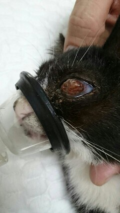 醫生檢查發現眼睛嚴重潰瘍,經初步清洗傷口,考慮貓咪還小,努力嚐試不要一次就摘除,所以採取先縫合部分眼瞼,每日點藥治療,試圖能保留眼球!