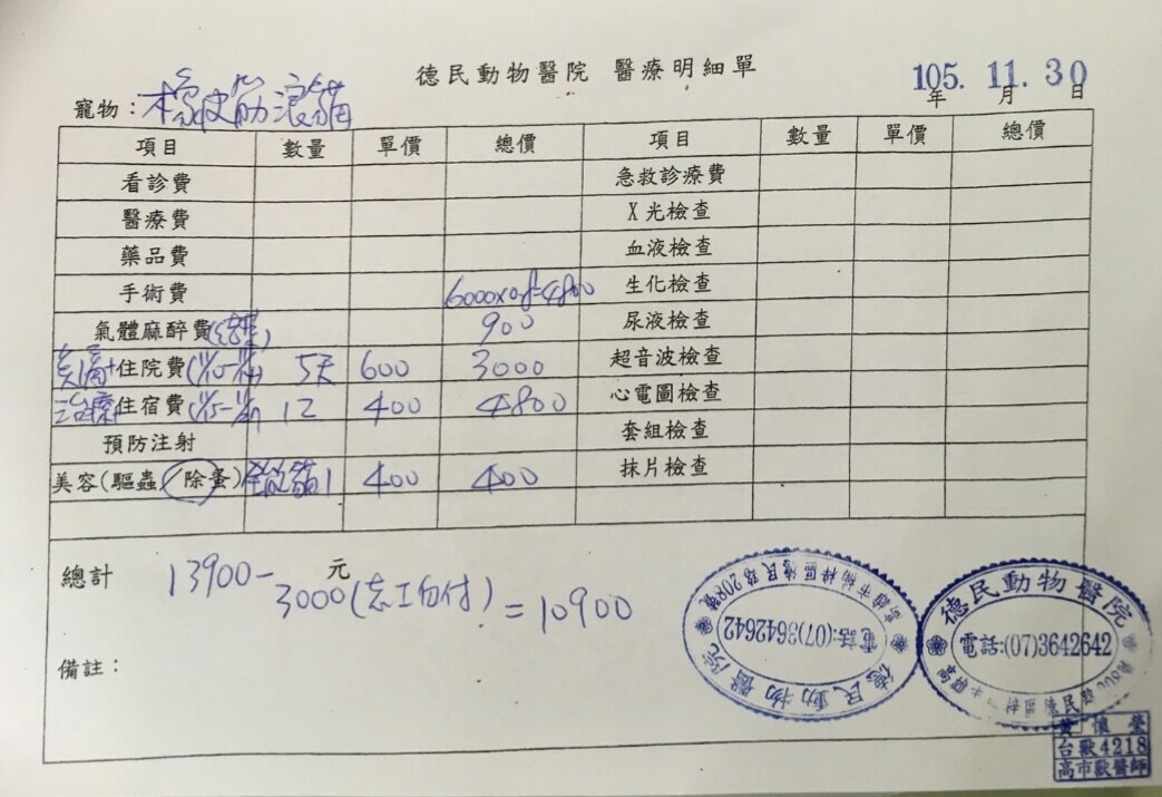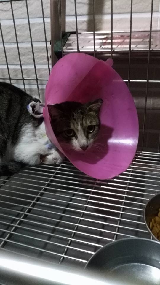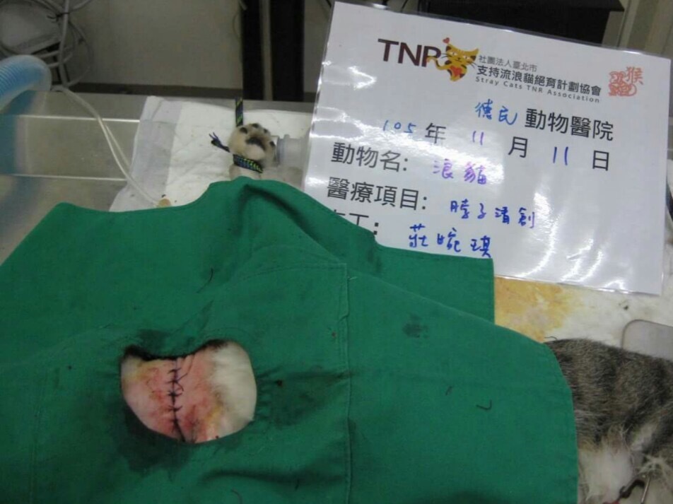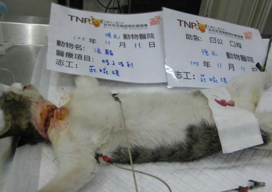 趕緊誘捕送醫,11/10晚上,醫生先麻醉拆除橡皮筋,醫生說明傷口有點深,但沒有割到氣管,待11/11日進行傷口縫合手術,以及結育剪耳手術