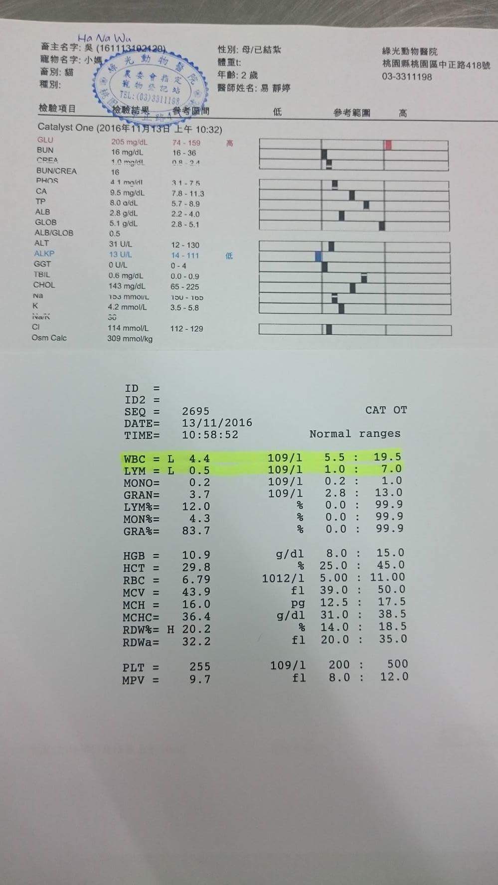 血檢報告 白血球偏低淋巴球偏低 X光片顯示肺部極為不尋常 醫生說是肺炎 先住院氧氣治療 因已有輕微脫水 所以同時給予皮下點滴補充水分穩定電解質 先將呼吸急促情況穩住 若2~3天情況不見改善 須檢驗何種病毒造成感染 才能做細菌培養醫療 給予治療藥物。
