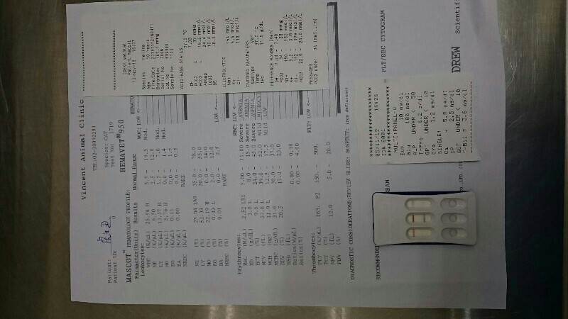 經過醫生抽血檢查,發現貓咪嚴重貧血,血檢HCT遠低於正常值以下只有9.5(正常值是24.0~~45.0)(低於20以下就必需緊急輸血)。醫生強烈要求緊急輸血!於是回台北貓屋帶血貓來比對。很幸運的第一隻就對上了。