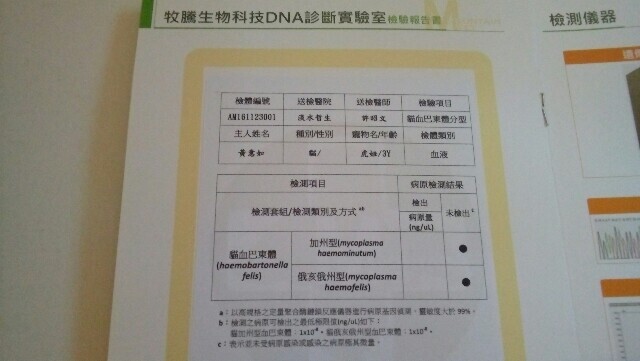 因為貓咪的貧血相當嚴重,情況特別,為慎重起見,住院期間幫貓咪驗血巴東,檢查結果還好過關!