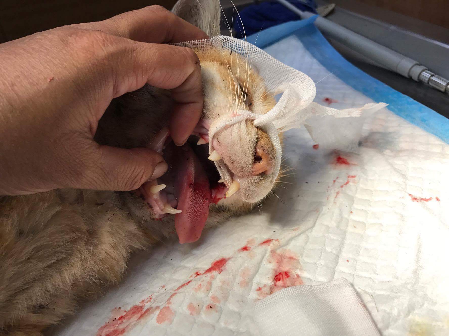 直到原po發文求助,我於11/23日接到捕獲的胖橘,而送台東市寶佳動物醫院治療,血液檢查並沒有貓白血病及貓愛滋病感染,口腔後方靠近咽喉處有明顯腫漲及發炎,舌頭也有潰瘍,認定為自發性口炎,目前陳醫師已將後方會刺激到口腔且明顯搖晃的牙齒拔除並清創