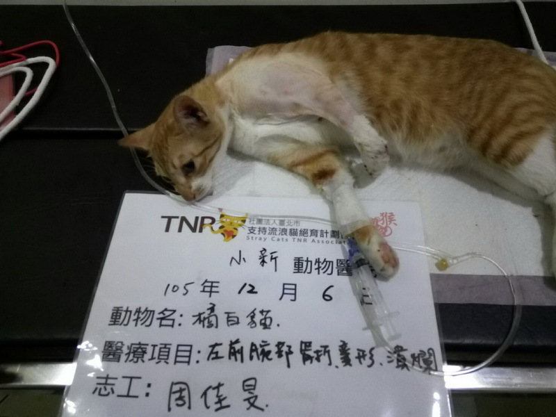 主題: 前腳嚴重變形彎曲的小橘 申請者姓名: 周佳旻 花色: 申請日期: 2016-12-24 08:03:56 申請者部落格: 申請者臉書網址: https://www.facebook.com/ 所在縣市/合作醫院: 高雄市/小新動物醫院 治療費用: 7300元 需求人數: 16人 已結案 (2022-05-13 15:20:34) 報名人員: Joyce Chen x2(已付款)、王秀琴(已付款)、王小盈(已付款)、伊兒小舖 x6(已付款)、Rachel Hsieh x2(已付款)、Rachel Hsieh x2、明益聯合實業有限公司 x2(已付款)、洪凱威 x2(已付款)、 候補人員: 動物病情說明: 一如往常的下了班將車子停好就會開始餵養生存在停車場裡的孩子們,走著走著發現車邊有一隻貓咪走路很緩慢,慢到讓我覺得他似乎受傷了,為了不想驚嚇他,我很緩慢的靠近他,想確定他是否受傷了。