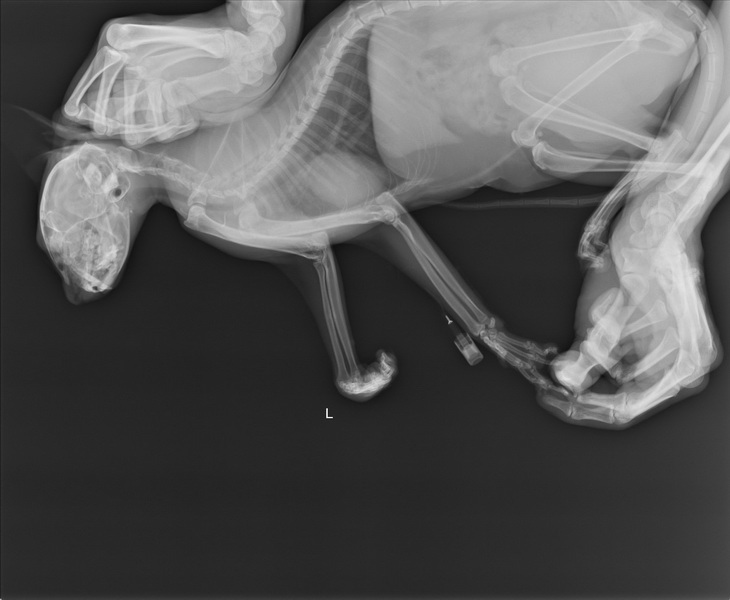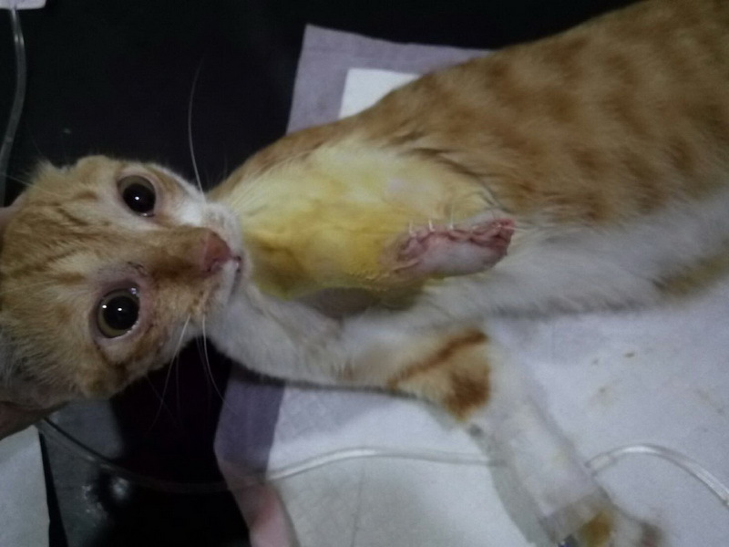 當我靠近他的時候,他一點也不害怕,完全不怕人甚至很親人,伸手摸他都可以。彎下腰準備要弄罐頭給他吃的時候才發現他的左前腳往內凹,嚴重變形了,頓時很想哭,不知道他受傷多久了,他一定很痛很痛。