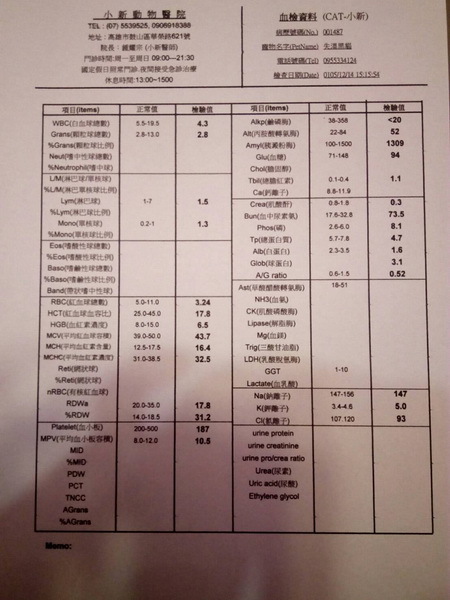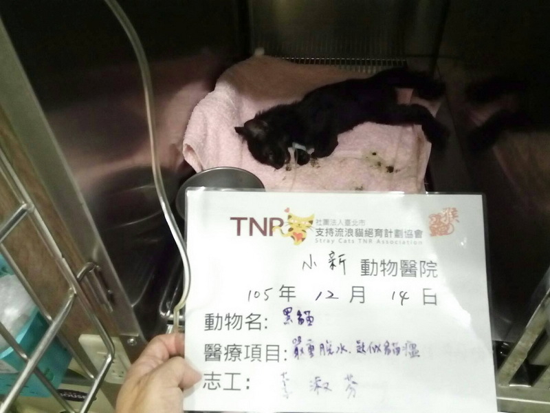 主題: 嚴重失溫的小小黑 申請者姓名: 李淑芬 花色: 申請日期: 2017-01-10 08:16:54 申請者部落格: 申請者臉書網址: 所在縣市/合作醫院: 高雄市/小新動物醫院 治療費用: 4800元 需求人數: 11人 已結案 (2022-05-13 15:20:03) 報名人員: nicole chen(已付款)、白婷(已付款)、KimmyChen(已付款)、Celine Lin(已付款)、Celine Lin、Mavis Pan(已付款)、鄭余丞(已付款)、Ellen Cheng(已付款)、Sky Lin(已付款)、Bor(已付款)、Fatefaye Wu(已付款)、洪凱威(已付款)、 候補人員: 動物病情說明: 凌晨3點多一如往常地來到這一站,寒流讓我冷到發抖,擺好餐具開始放飯,這時左後方的變電箱方向傳來一陣小小聲的幼貓叫聲,因為那區我百分百的完成TNR,3年沒出現過小貓了,所以我以為是風聲而不是很在意,聲音時有時沒有的,於是開始找聲音來源,天哪!!!變電箱的小縫裡有一團黑毛球耶,而她就是聲音的來源,仔細看看她,非常沒活力的窩在那裡,叫聲也很虛弱,當下不管是否還有多少點沒餵完,拔下圍巾包住她,再用外套包住,直奔便利商店買暖暖包,先帶他回家再說了,到家後有先試著用溫熱水幫她泡澡,燈照能保溫的都用上了,天一亮立刻送醫,醫生看完之後說小黑不是很妙,嚴重的失溫和營養不良,不樂觀!但,我還是拜託醫生盡力救他 動物近況說明: 小黑在住院的期間狀況一直不穩定,到第5天的早上,醫師打給我說不是很好,要有心理準備,沒多久小黑就走了,謝謝鐘醫師只算3天的費用,謝謝小新動物醫院的幫忙與照護,送小黑最後一程的費用還望大家多多幫忙,謝謝!
