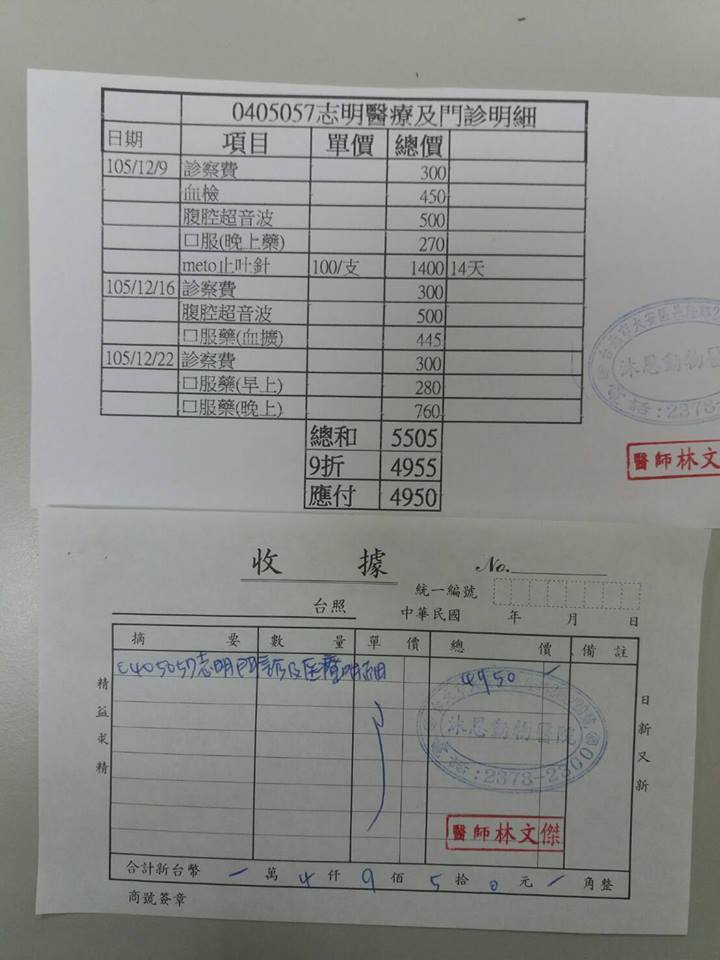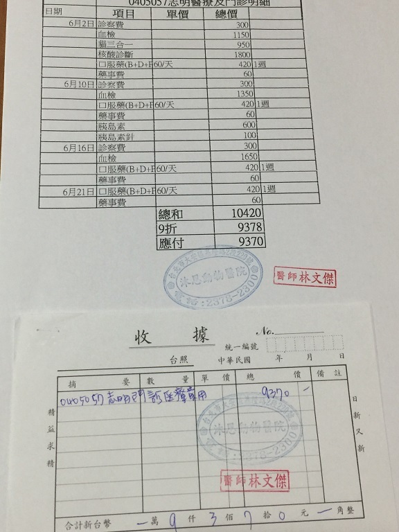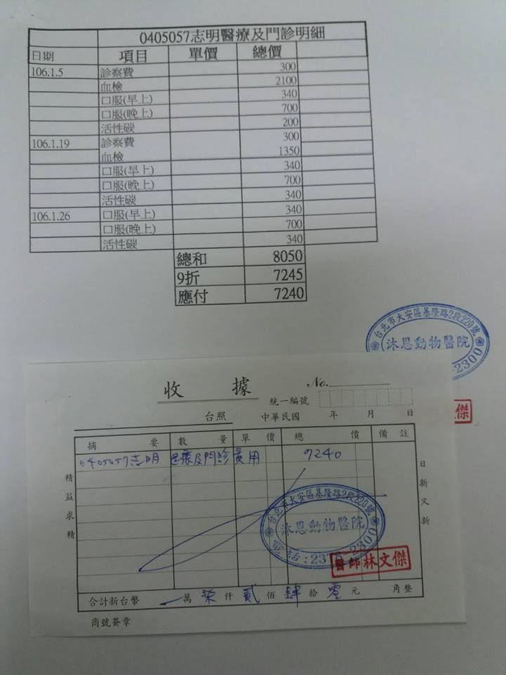 非常感謝您!動物近況說明: 2017年2月22日新增106年1月回診收據、回診紀錄如下--