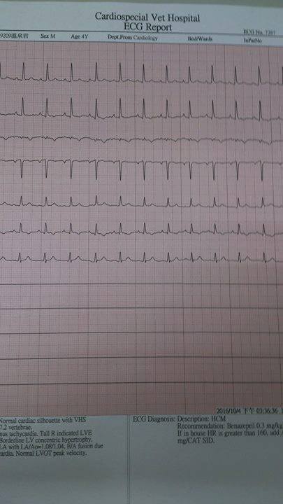 後來發現溫泉的心臟會有顫動的問題,因此需要定期至專心動物醫院回診治療,目前溫泉體重4.15KG,血壓148,並做了心臟X光、血檢、心電圖、心臟超音波等檢查,各項數值皆與之前差不多,顯示維持得不錯,繼續服藥就可以,只是醫生擔心他心臟偶爾會顫動,希望在他平靜的時候,可以幫他側一下心跳,測量方式為:手摸他胸口,測量一分鐘跳幾次,持續側一周,若每分鐘超過160下,則需調整藥量,若沒超過,就繼續保持現狀。
