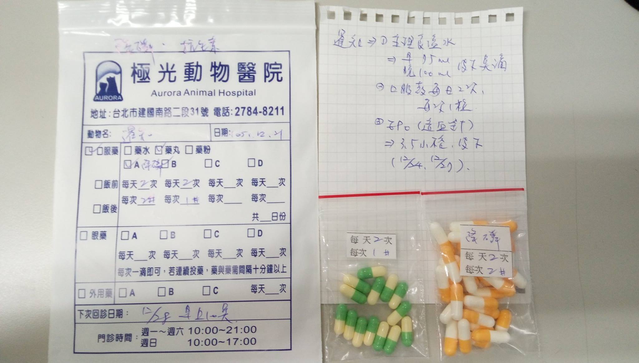 這次開藥:降磷藥每天兩次,早晚各一次,每次兩顆、