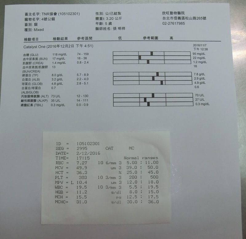 主題: 貢寮不吃不喝生病橘貓 申請者姓名: 臺北市支持流浪貓絕育計劃協會 花色: 申請日期: 2016-12-28 00:40:22 申請者部落格: 申請者臉書網址: https://www.facebook.com/SupportTNR/ 所在縣市/合作醫院: 台北市/欣旺動物醫院 治療費用: 32400元 需求人數: 34人 已結案 (2019-07-11 13:24:52) 報名人員: 王小盈(已付款)、Bubu Wang(已付款)、蘇小優(已付款)、David Chang(已付款)、薇薇安(已付款)、Selene Tsai(已付款)、Frenkie Lee(已付款)、張志暐(已付款)、lunyi(已付款)、We We Lin(已付款)、Cass Liu(已付款)、貝貝(已付款)、Ann Wong(已付款)、chanelwang(已付款)、vita、寶媽(已付款)、王媽媽(已付款)、趙嘉馨(已付款)、小雷(已付款)、林嘉慧(已付款)、蔡翔恬(已付款)、宅貓先生(已付款)、Amber Chung(已付款)、露西(已付款)、Bubu Wang(已付款)、Carrie Wu x2(已付款)、藍(已付款)、韓風 x2(已付款)、何春生(已付款)、蘇小優(已付款)、Ray0322(已付款)、Lawrence x2(已付款)、 候補人員: 動物病情說明: 助罐計劃贊助對象貢寮愛媽11月來電告知,