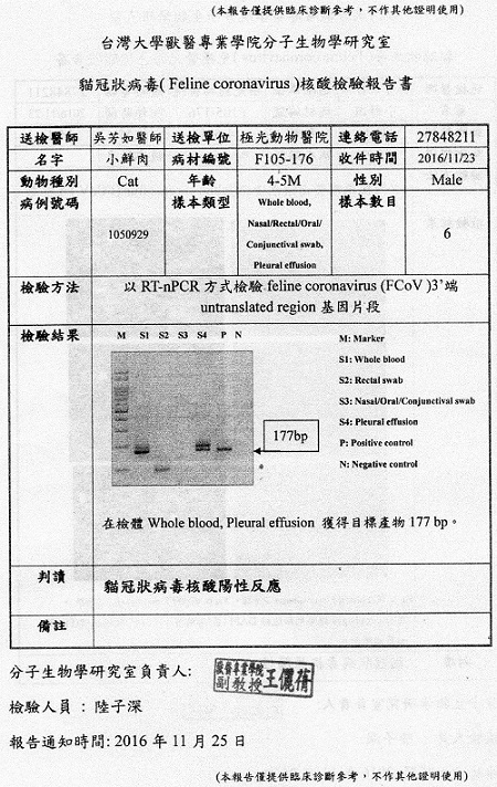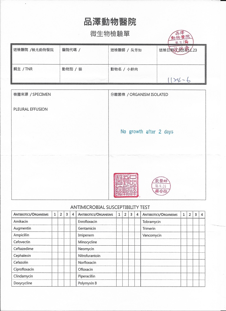 無奈這孩子經歷了收容所的驚嚇,到協會時又因換環境緊張、壓迫,導致身體虛弱的他,染上呼吸道病毒感染,更致命的是,傳染性腹膜炎,在我們能做的範圍內,請極光動物醫院的醫師團隊為我們拯救小鮮肉,一共做了紅白血球檢測、血液生化檢查、X光片、細菌培養、核酸診斷、免疫螢光檢驗、超音波、細胞學檢查、24小時靜脈點滴、靜脈第一、二線抗生素、靜脈制酸劑、皮下點滴注射、口服第一、二線抗生素、口服化痰藥、靜脈制酸劑、靜脈抗組織胺針劑、食慾促進劑、血管擴張劑、靜脈類固醇針劑、消化酵素、止吐針劑、抽胸水鎮靜藥物,住院8天,能做的我們都做了,卻不見好轉。