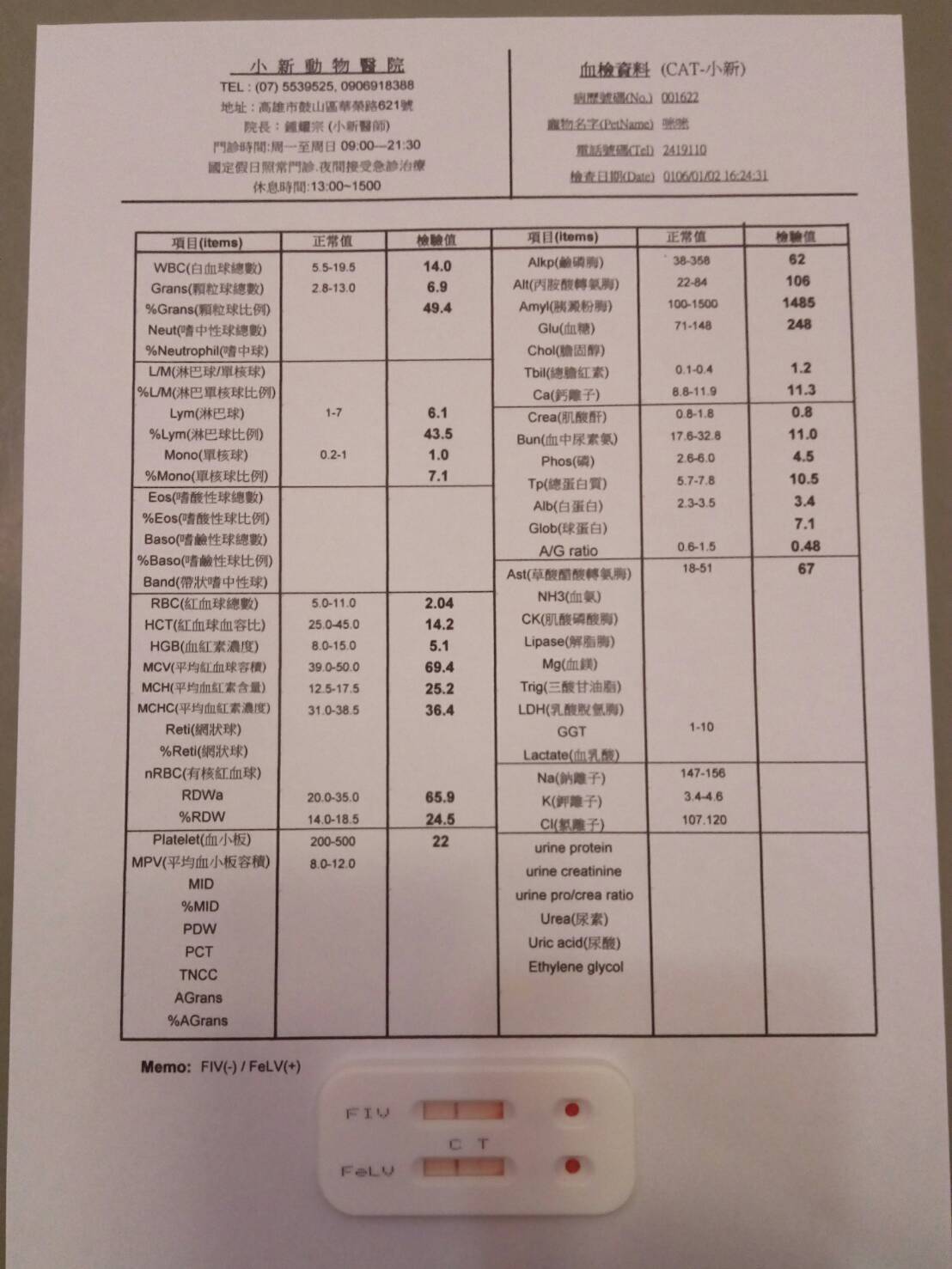 咪咪厭食超過一週,發燒41.3度,有黃疸及黏膜蒼白;血檢發現有嚴重的貧血,肝指數偏高,球蛋白偏高,懷疑有血液寄生蟲,需要另送PCR篩檢;x光發現脾臟腫大,貓二合一篩檢發現有白血病,目前先點滴輸液治療,給予血液寄生蟲藥物及肝藥。動物近況說明: 咪咪目前已於1/12出院。