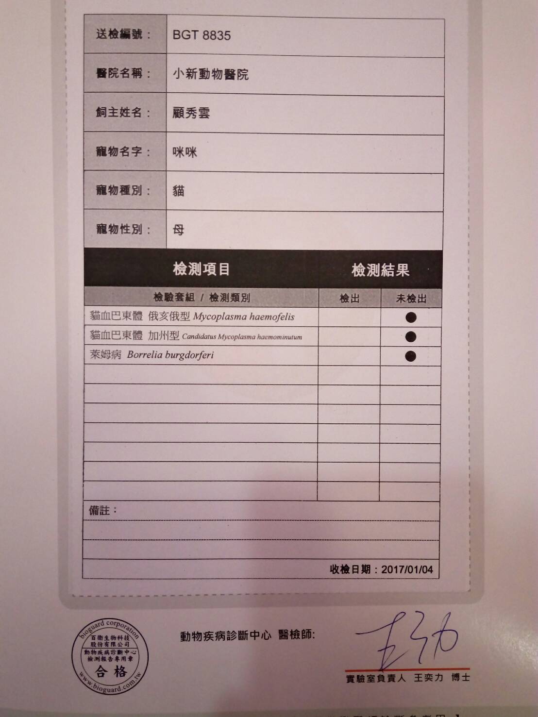 雖然PCR篩檢結果顯示咪咪沒有血液寄生蟲的,但咪咪還是有貧血、肝指數偏高以及脾臟腫大的問題,所以還是開立1週份的口服藥,之後仍需回診追蹤病況。