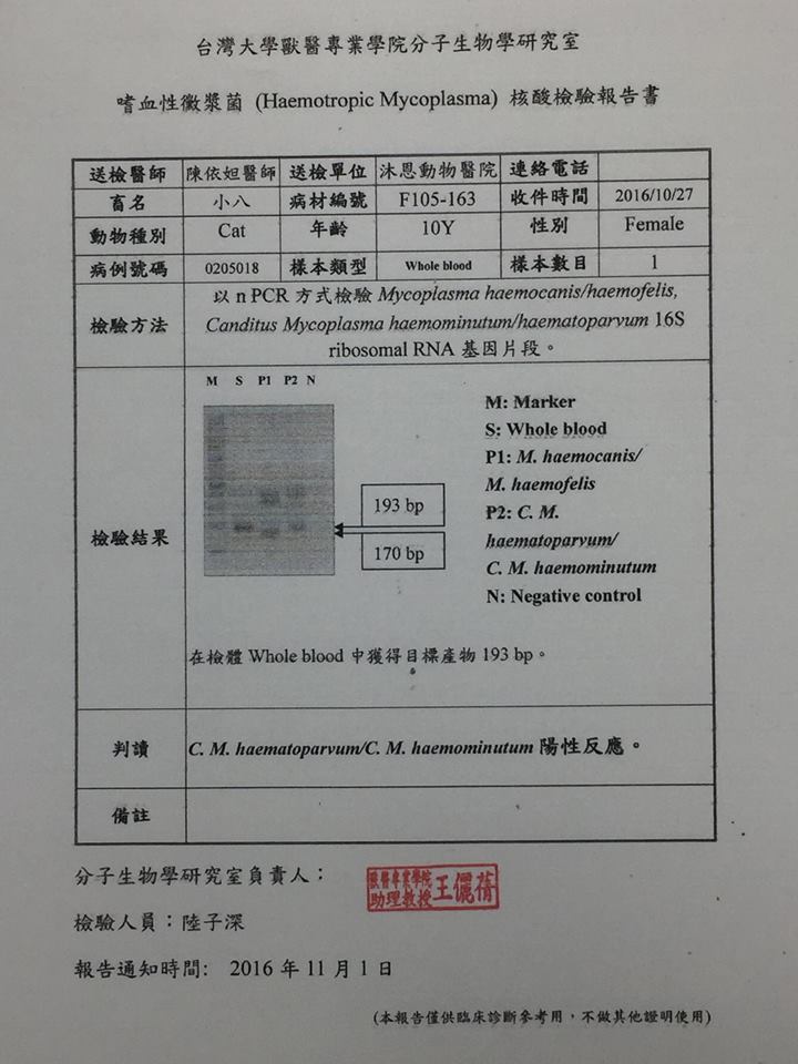 小八之前因體內血巴東蟲導致溶血性貧血,