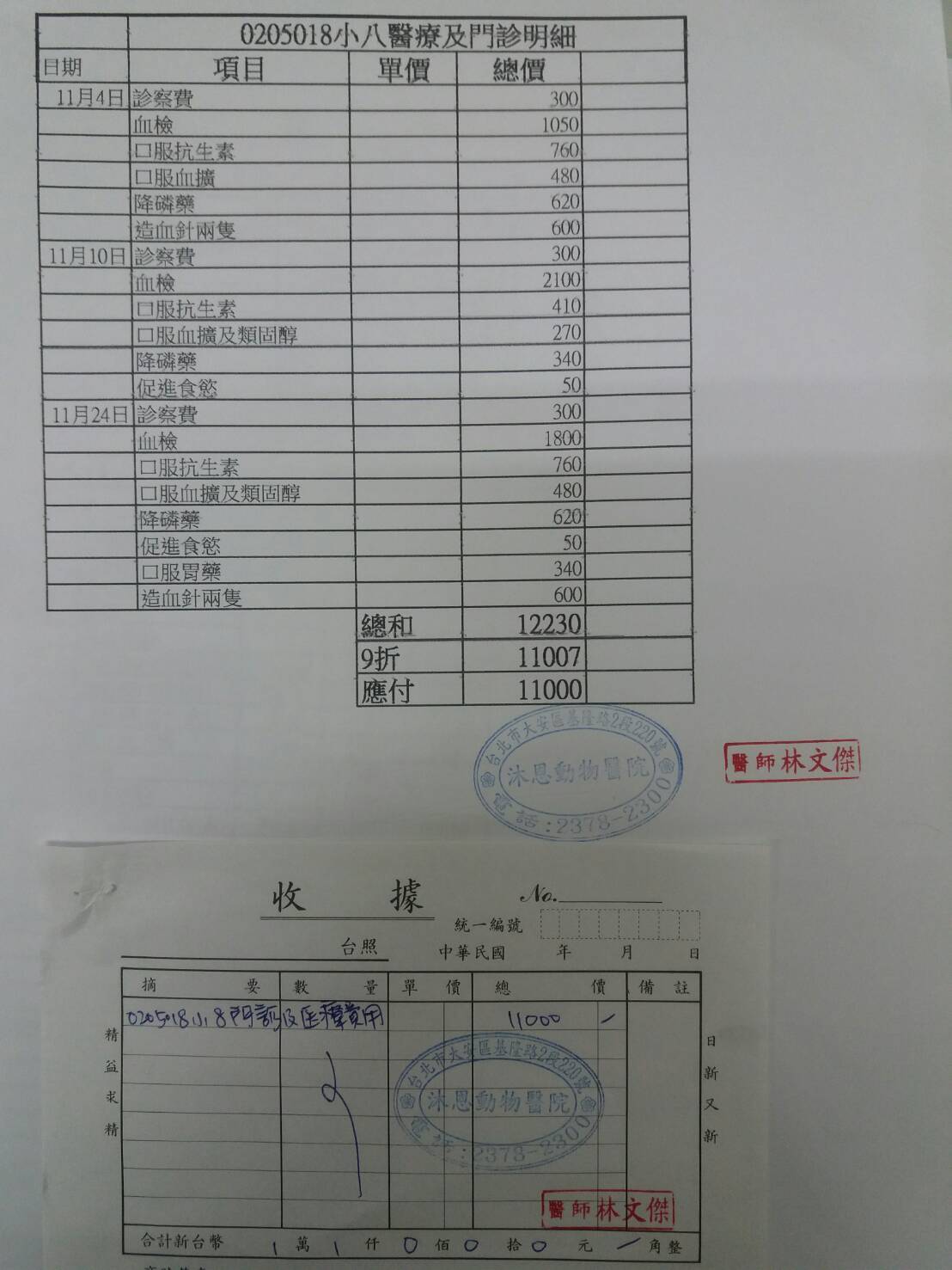 其中包含血檢、胰臟炎檢驗、點滴、抗生素、胃藥、降磷藥、致酸劑、