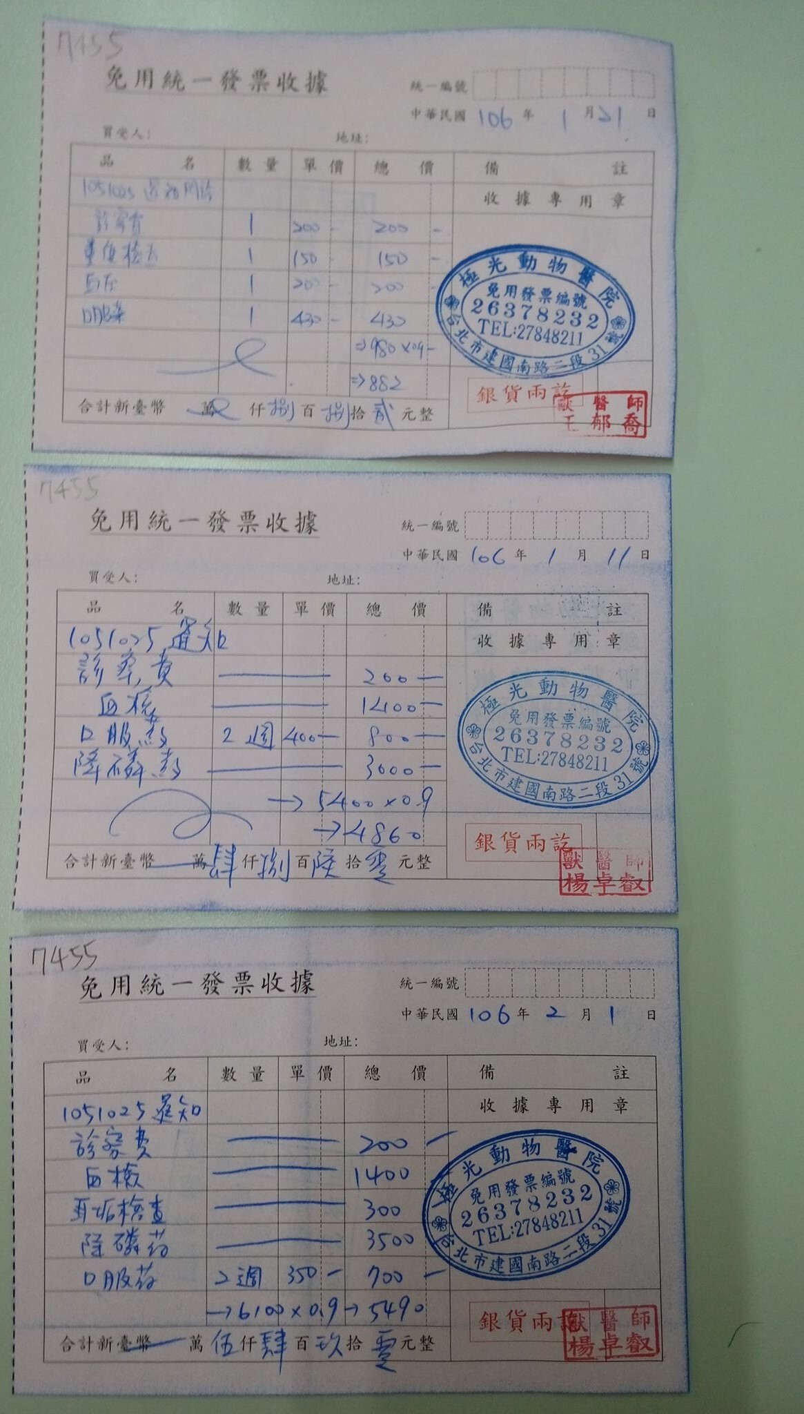 暹知近日有嘔吐與軟便的狀況,今天回診做糞檢,發現有梨形鞭毛蟲,此種蟲需要開殺蟲藥吃,來源可能是之前喝到不乾淨的水而傳染的,暹知的排泄物用具、嘔吐物沾到的布等等要用廣衛消毒,並且每三天換一次貓砂盆,下次換砂時間,1�24(二)。